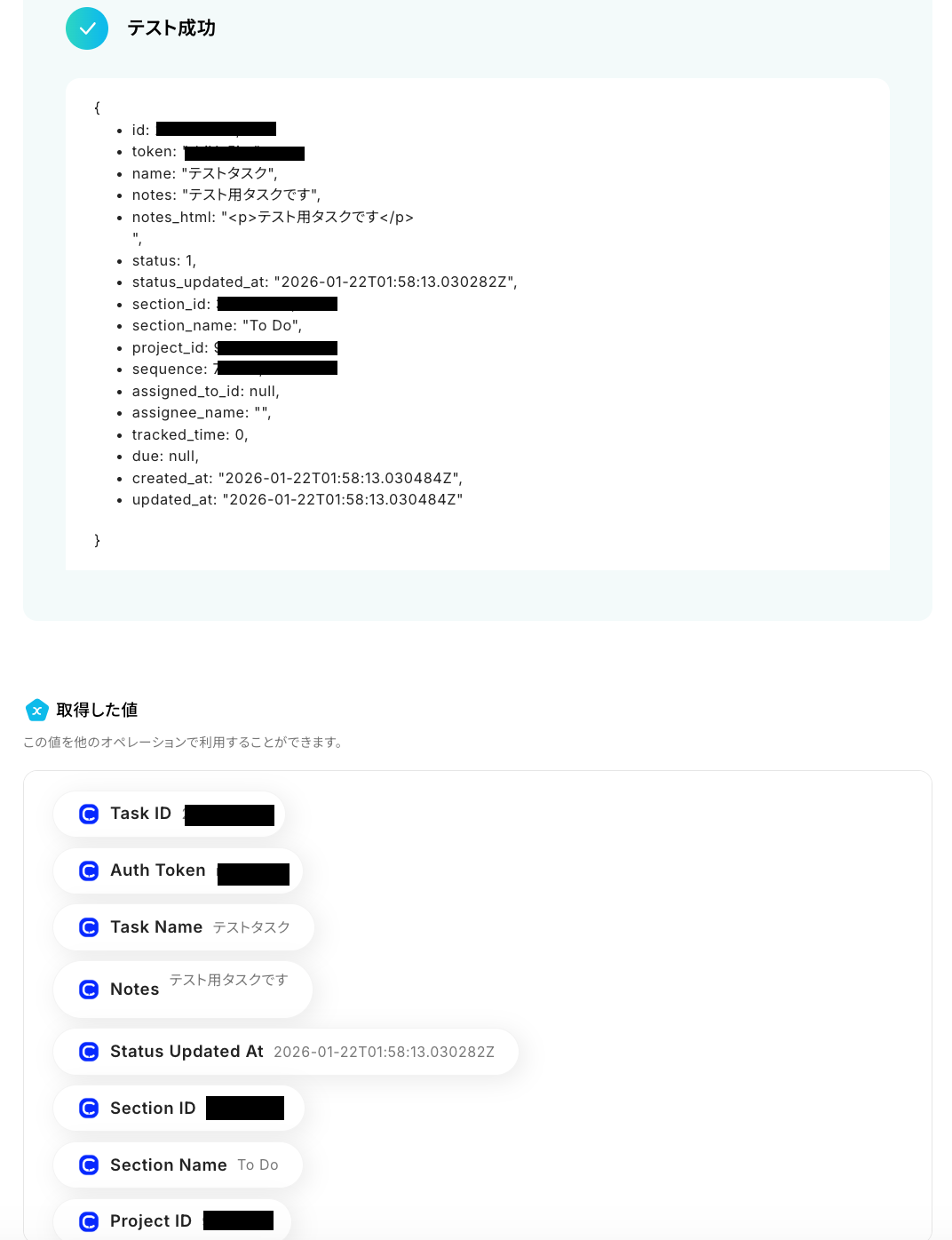 - 最後に、オペレーションでMeisterTaskの「Create Task」アクションを設定し、抽出した情報をもとにタスクを作成します