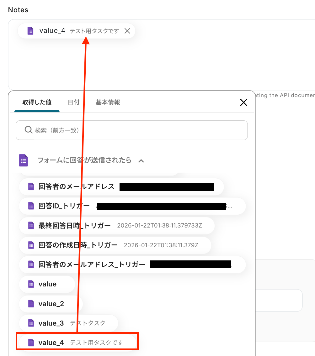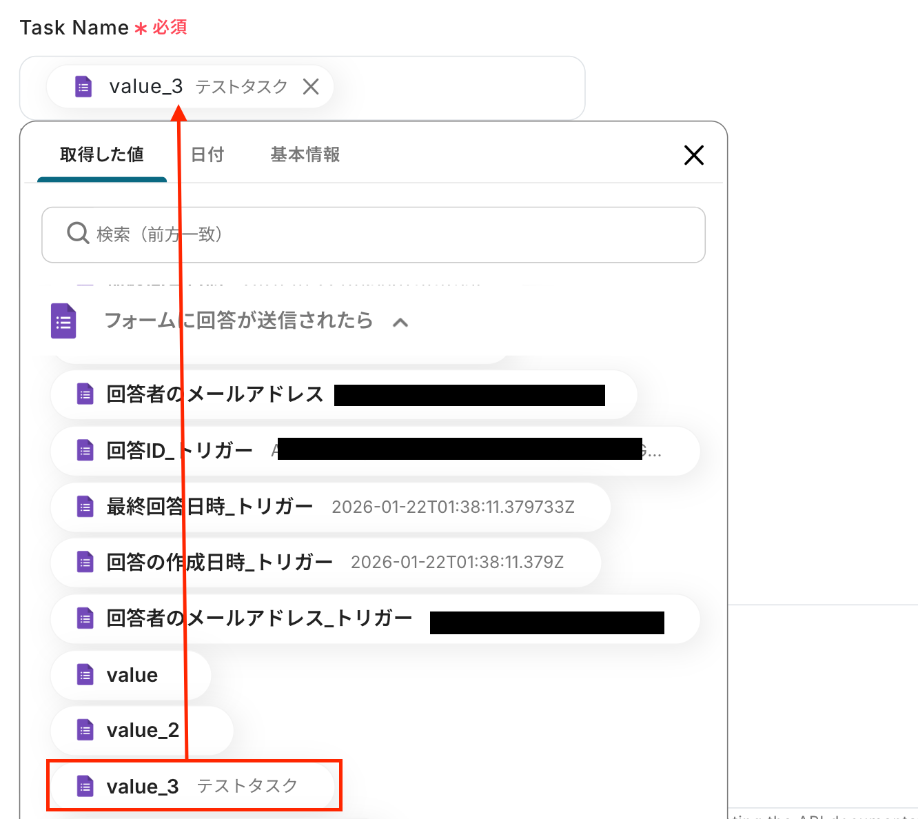 Task Name:Googleフォームのトリガー設定で取得した値を引用して設定しましょう。