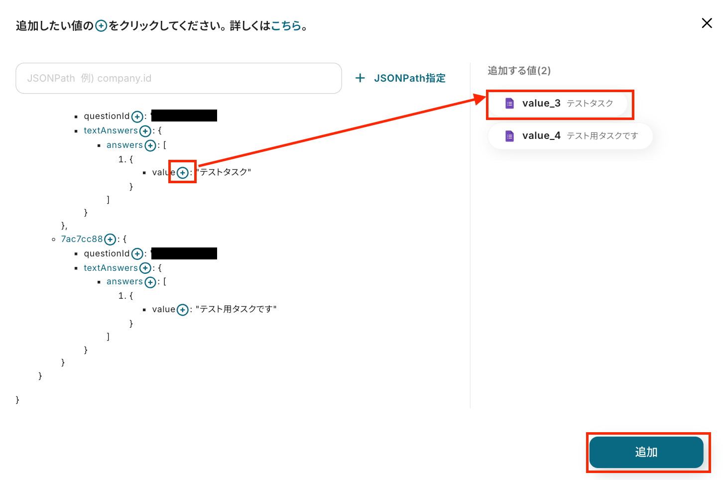 - 取得したい内容の左にある「+」をクリックし、「追加」をクリックしてください。