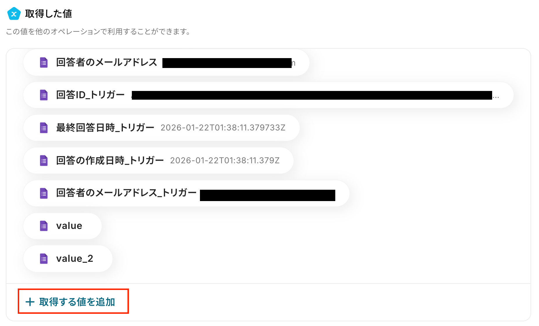 - Typeformの回答内容を取得する方法は「『取得する値』を追加する方法」をご参照ください。