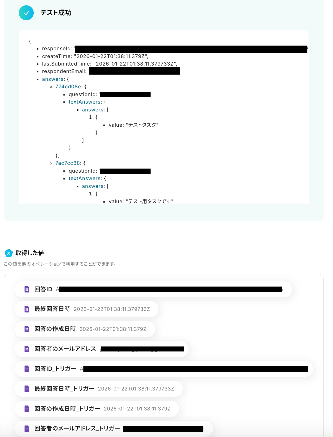 - Googleフォームをトリガーとして使用した際の回答内容を取得する方法は「Googleフォームトリガーで、回答内容を取得する方法」を参照ください。