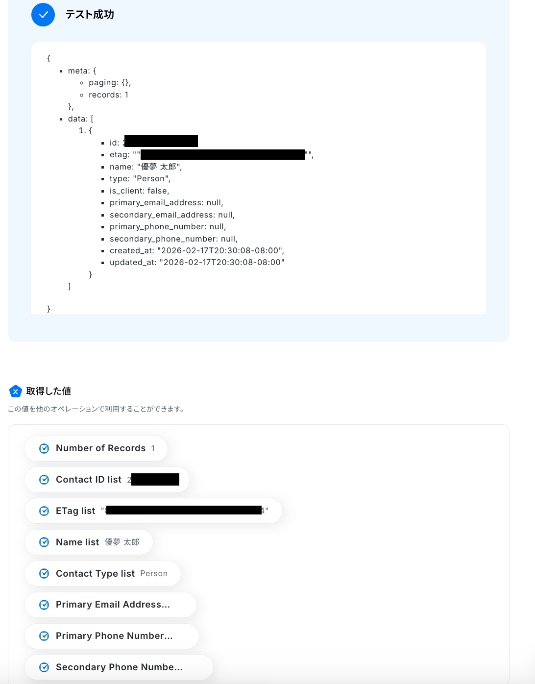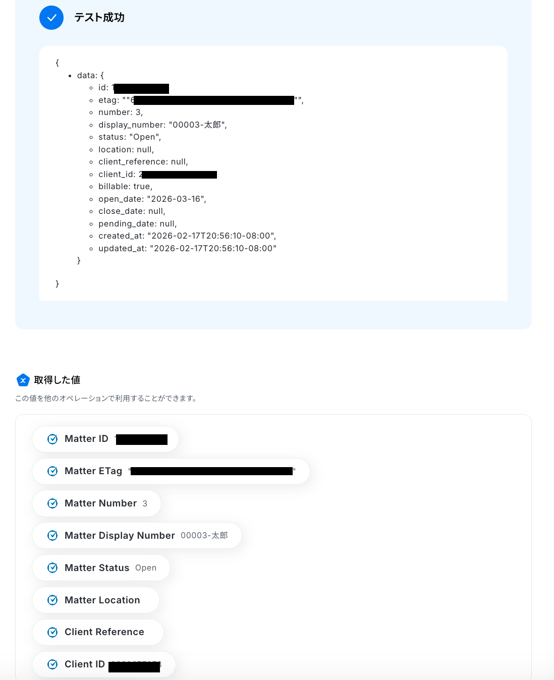 テストに成功すると、取得した値が表示されます。