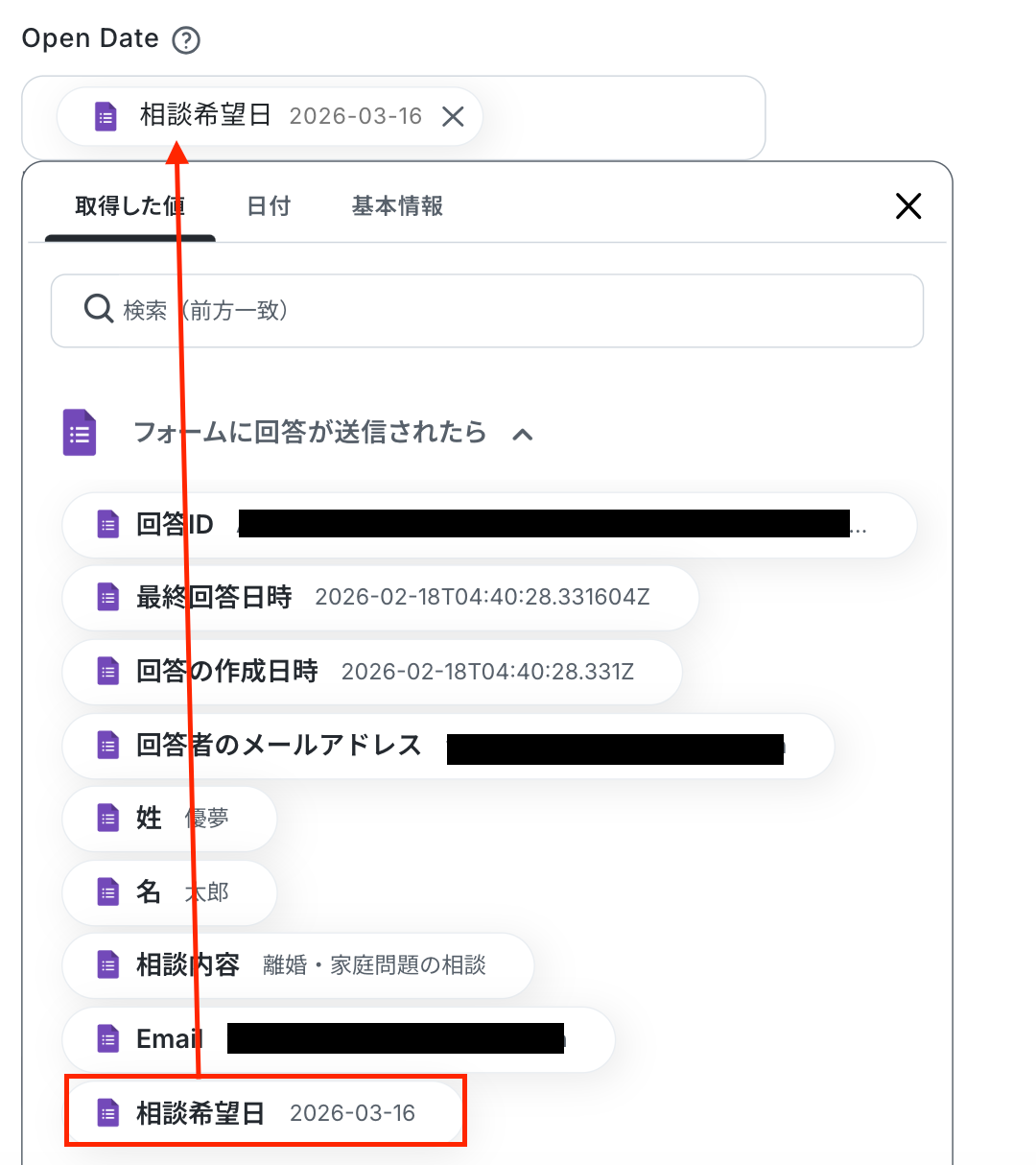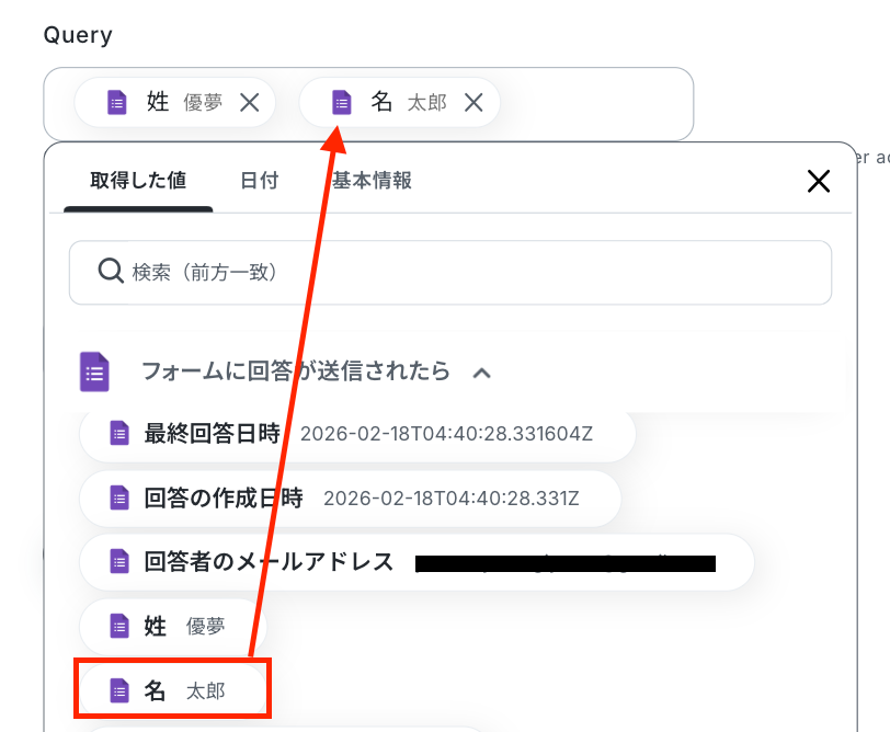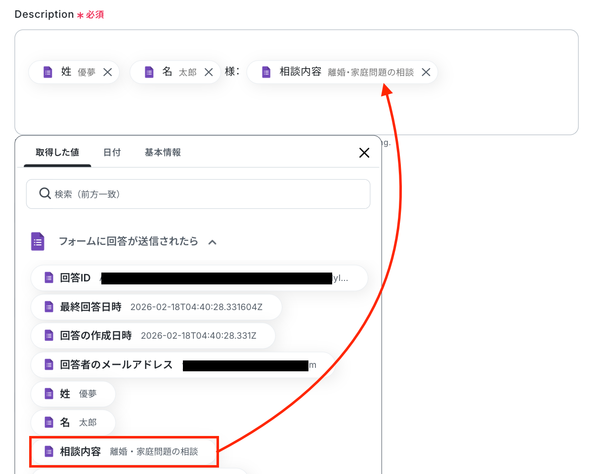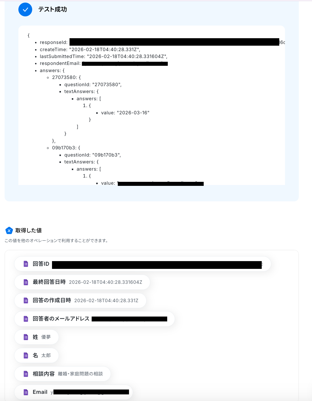 - Typeformの回答内容を取得する方法は「『取得する値』を追加する方法」をご参照ください。