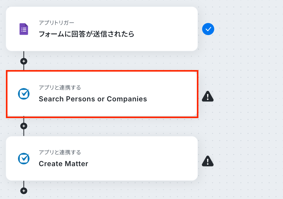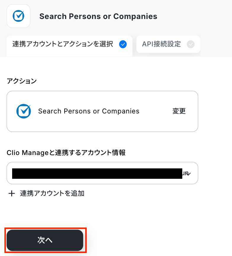 - 次に、オペレーションでClio Manageの「Search Persons or Companies」を設定します。