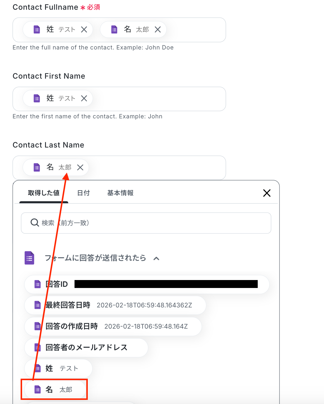 API接続設定画面で、以下の項目を設定します。「Contact Fullname」 ・「Contact First Name」・「Contact last Name」 は、Googleフォームの設定で取得した値から設定してください。【Tips】 取得した値を活用することで、フローボットを起動する度に変動する値として反映されます。これにより、毎回変動する情報を手動で入力する必要がなくなり、効率的に連携できます!