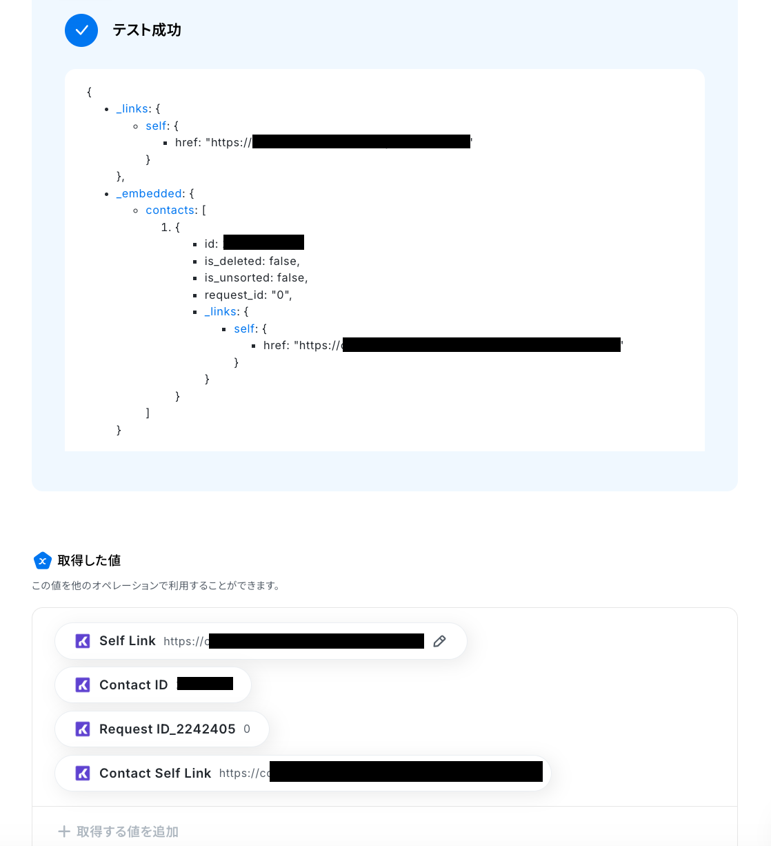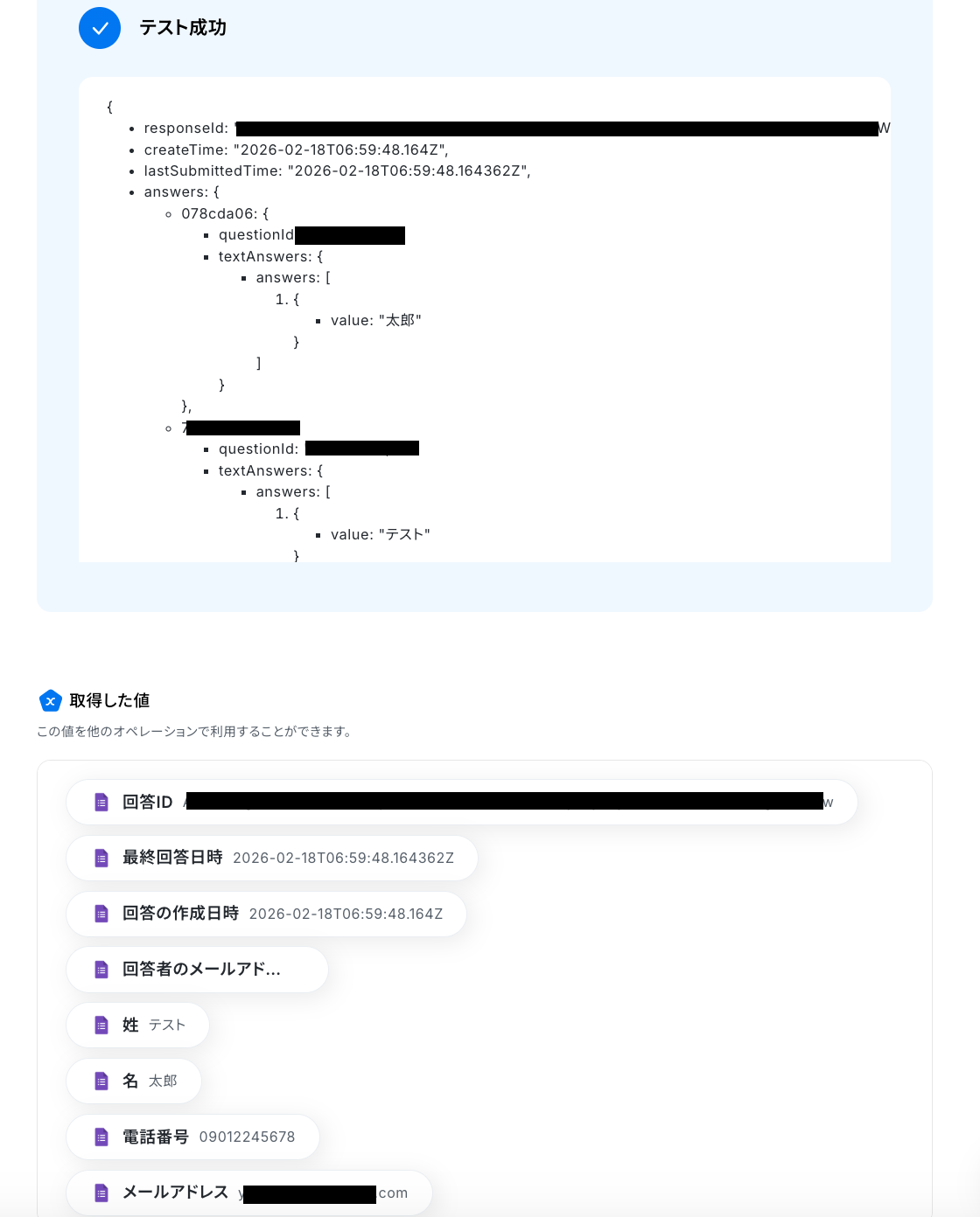 ここまでの設定ができたら、テストをクリックしましょう! テストに成功すると、取得した値が表示されます。※Googleフォームからデフォルトで取得できる情報は、「回答ID」、「最終回答日時」、「回答の作成日時」、「回答者のメールアドレス」のみです。 そのため、ユーザーの回答内容を取得するには、手動で追加する必要があります。 以下の手順を参考にして、回答内容を取得しましょう。