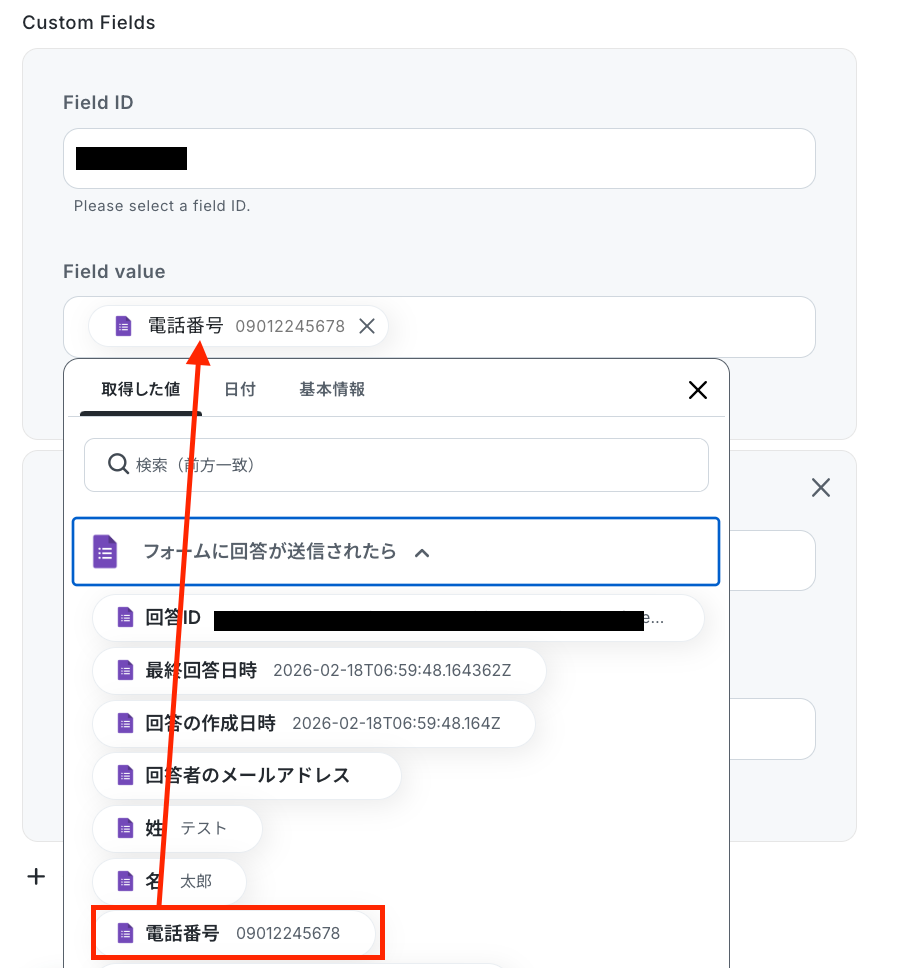 「Field value」 は、Googleフォームの取得した値を引用して設定します。