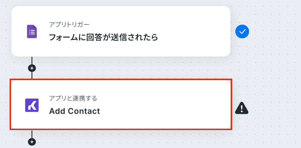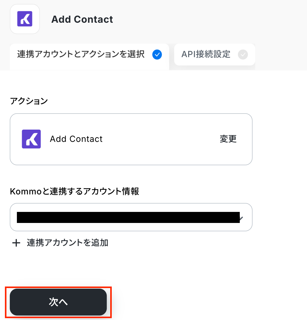 ステップ4:Kommoのアクション設定 最後の設定です! ここでは、KommoにContactを追加する設定を行います。 赤枠部分をクリックしてください。