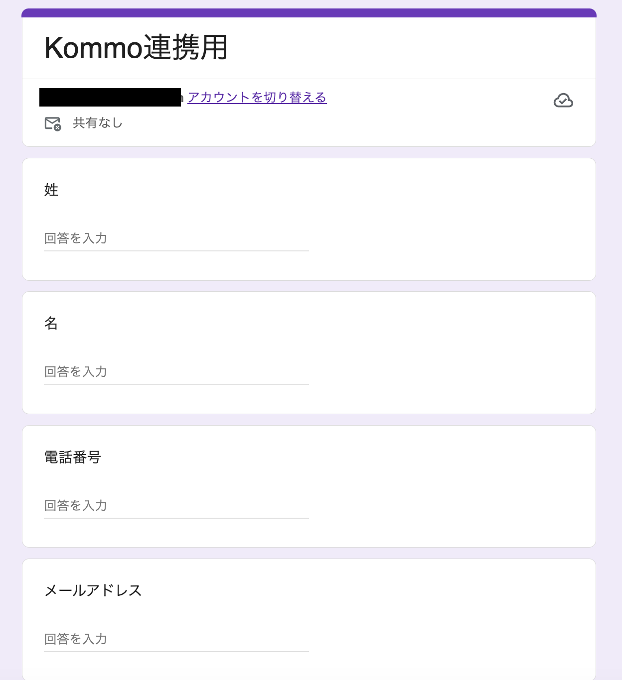 ここで、Googleフォームの画面で、トリガーとなるGoogleフォームの用意をしましょう。 後続のオペレーションでKommoにContactを追加するため、「姓」・「名」・「電話番号」・「メールアドレス」 を項目に設定しました。設定を終えたら、必ずフォームにテスト回答をしてくださいね!