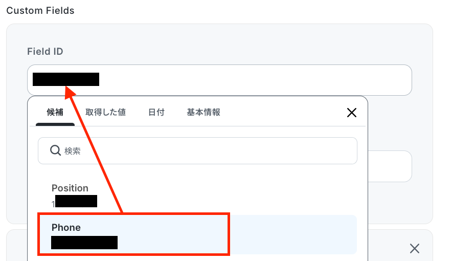次に「Custom Fields」を設定していきます。「Field ID」 は、入力欄をクリックして表示される「候補」から選択してください。