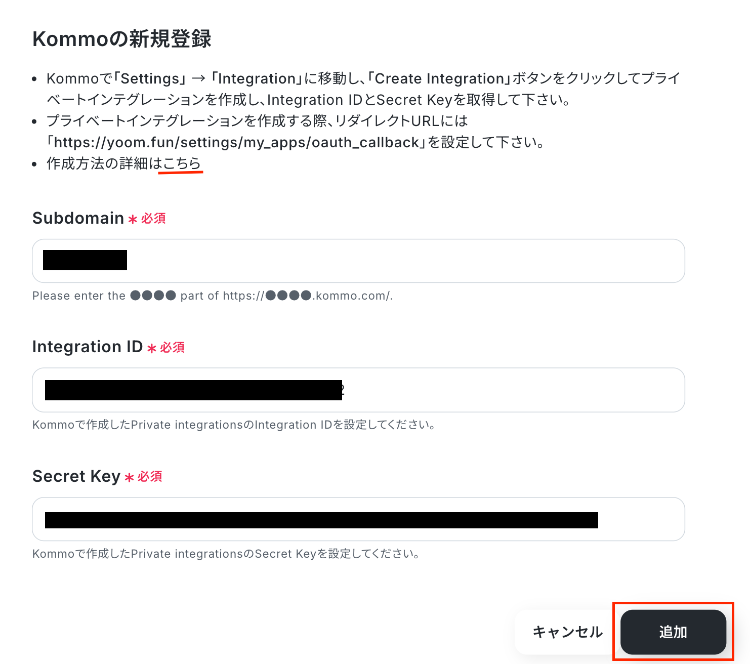 入力欄にKommoと入力するとアイコンが表示されるので、アイコンをクリックします。 以下の画面が表示されたら、必須項目を入力し、「追加」をクリックしましょう。 ※詳細については、以下のリンクを参考に値を取得してください!