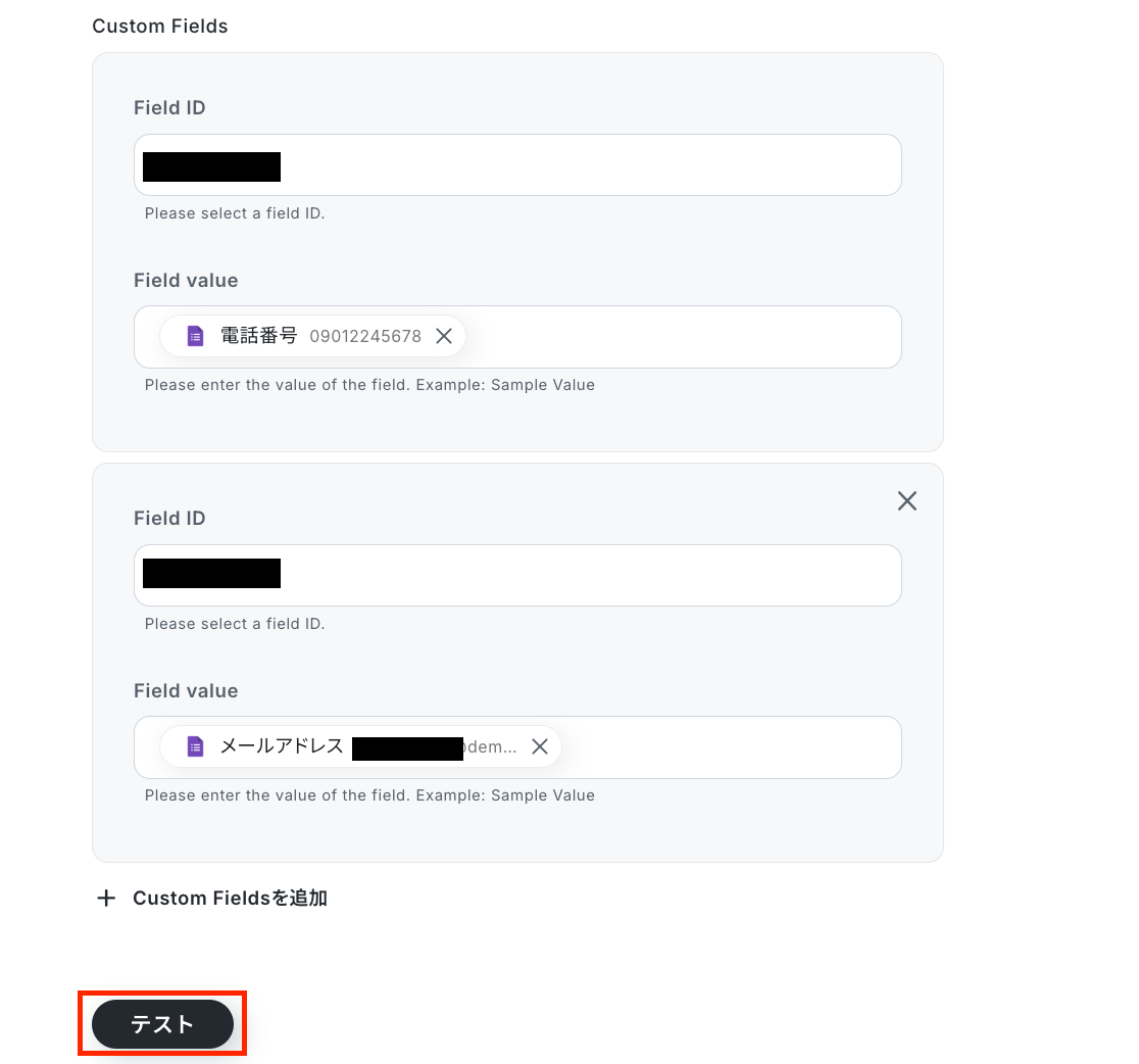 必要に応じて、Custom Fieldsを追加したら、テストをクリックしてください。