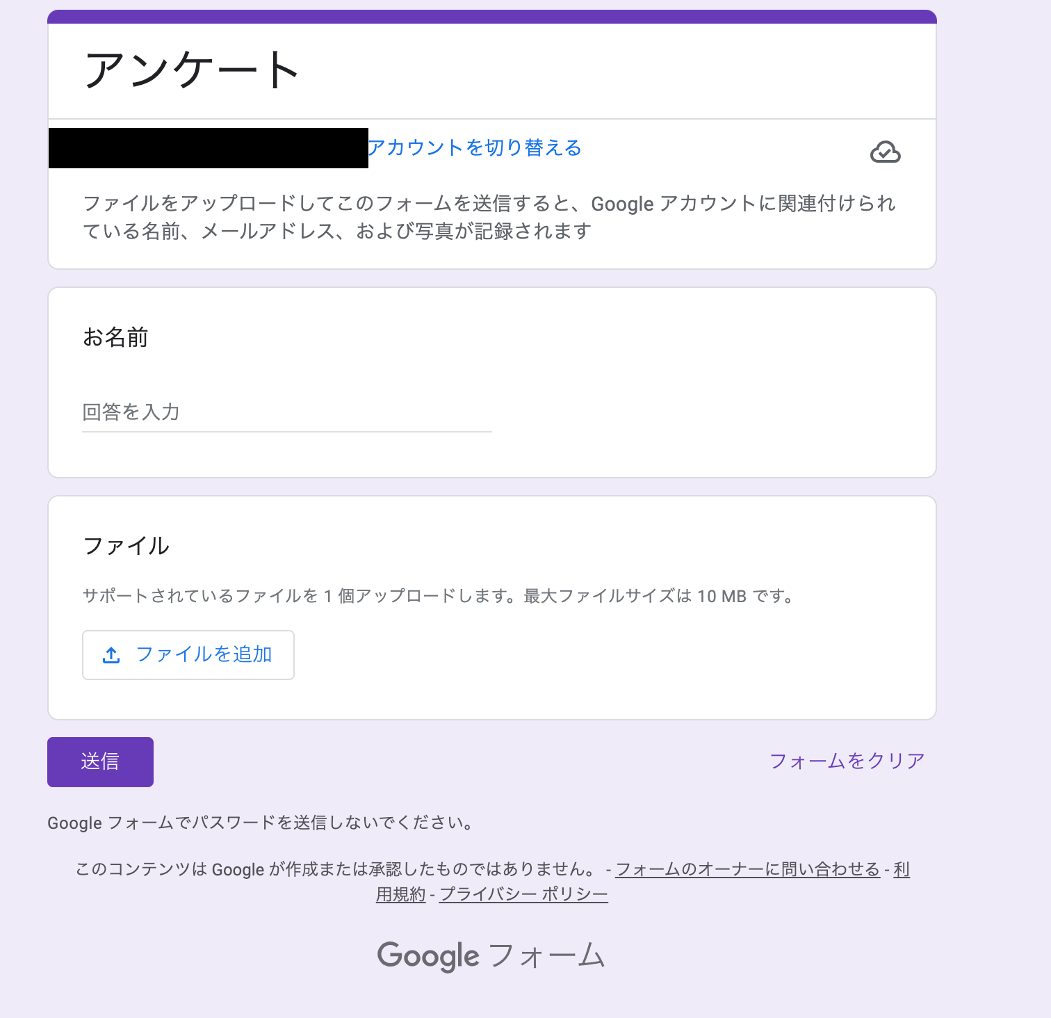 設定が終わったらテストのため、Googleフォームで回答者としてフォームに記入し、送信してください。なお、今回はテストとして以下のフォームを使用しています。