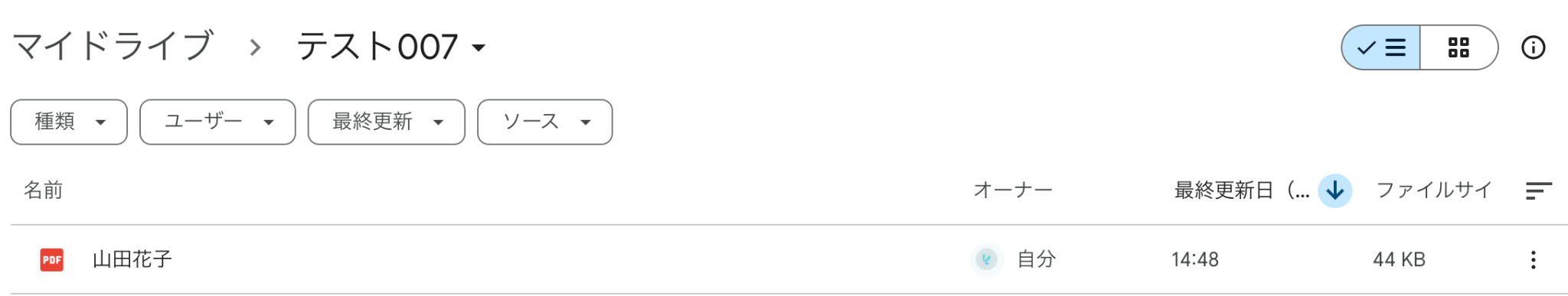 設定が完了したら「テスト」をクリックし、Google Driveの指定フォルダにファイルが格納されていることを確認してみましょう。