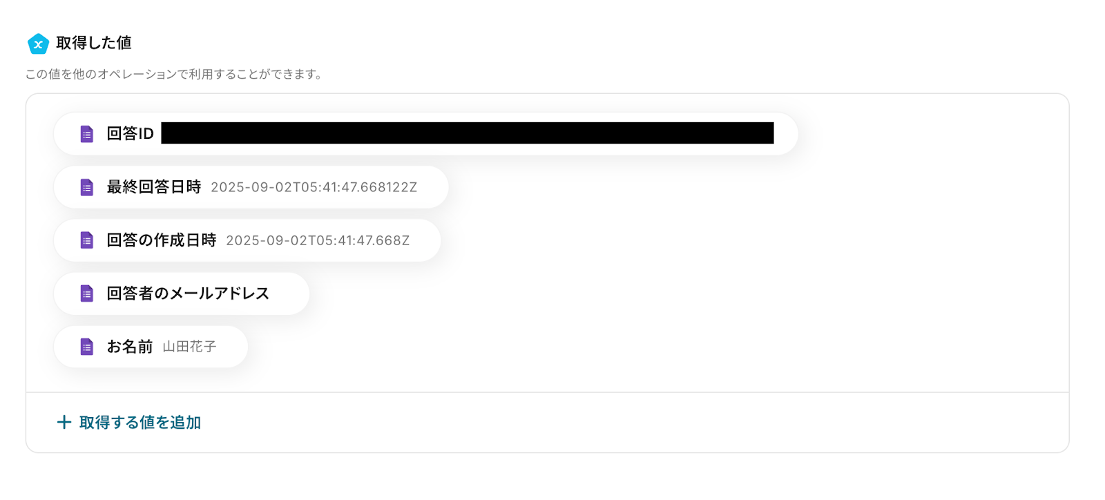なお、YoomのGoogleフォームでは、デフォルトで取得できる値は、「回答ID」「最終回答日時」「回答の作成日時」「回答者のメールアドレス」のみとなっており、ユーザーの回答内容を取得するためには、手動でアウトプットを追加する必要があります。