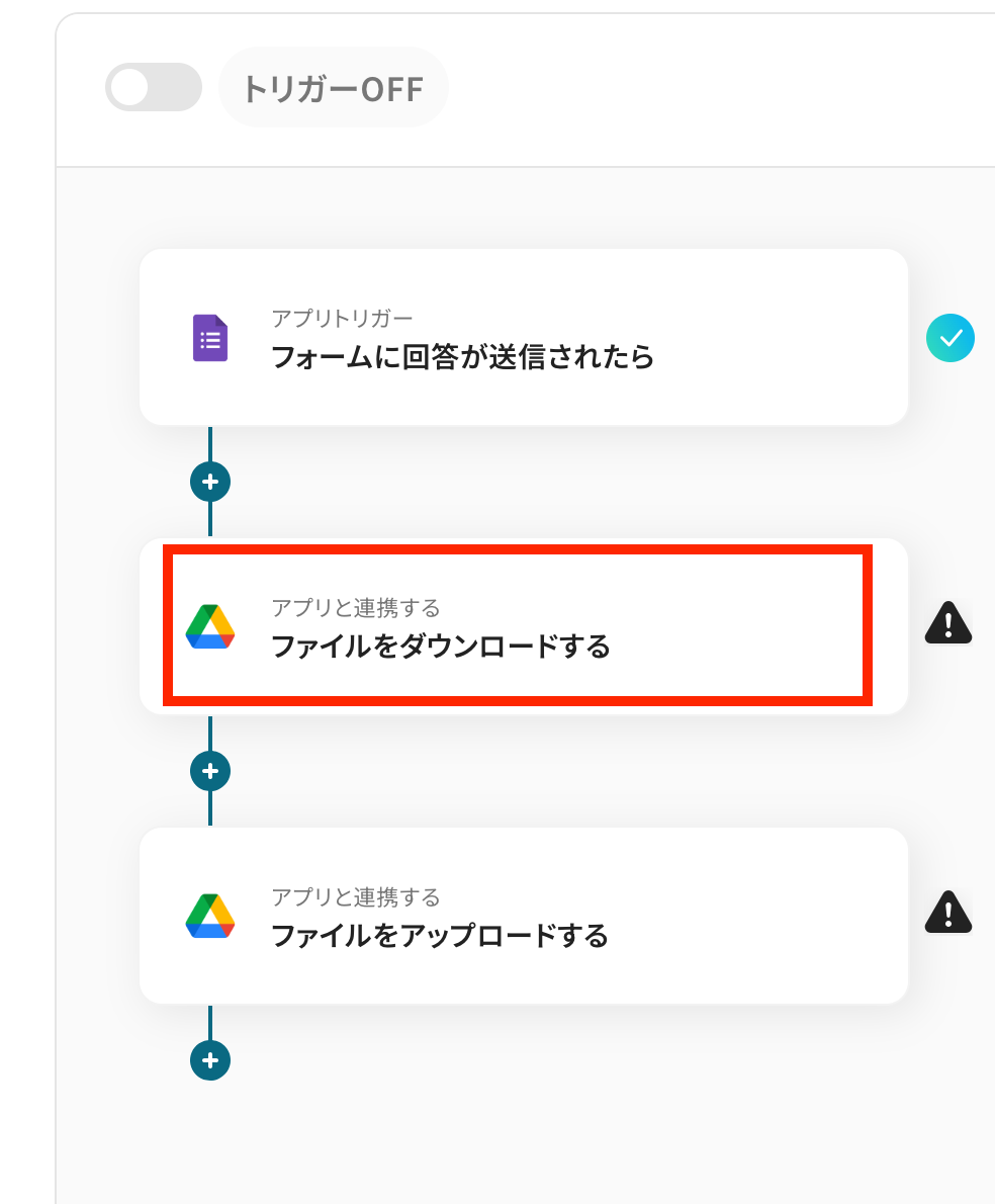 - Googleフォームのトリガー設定およびGoogle Driveのアクション設定