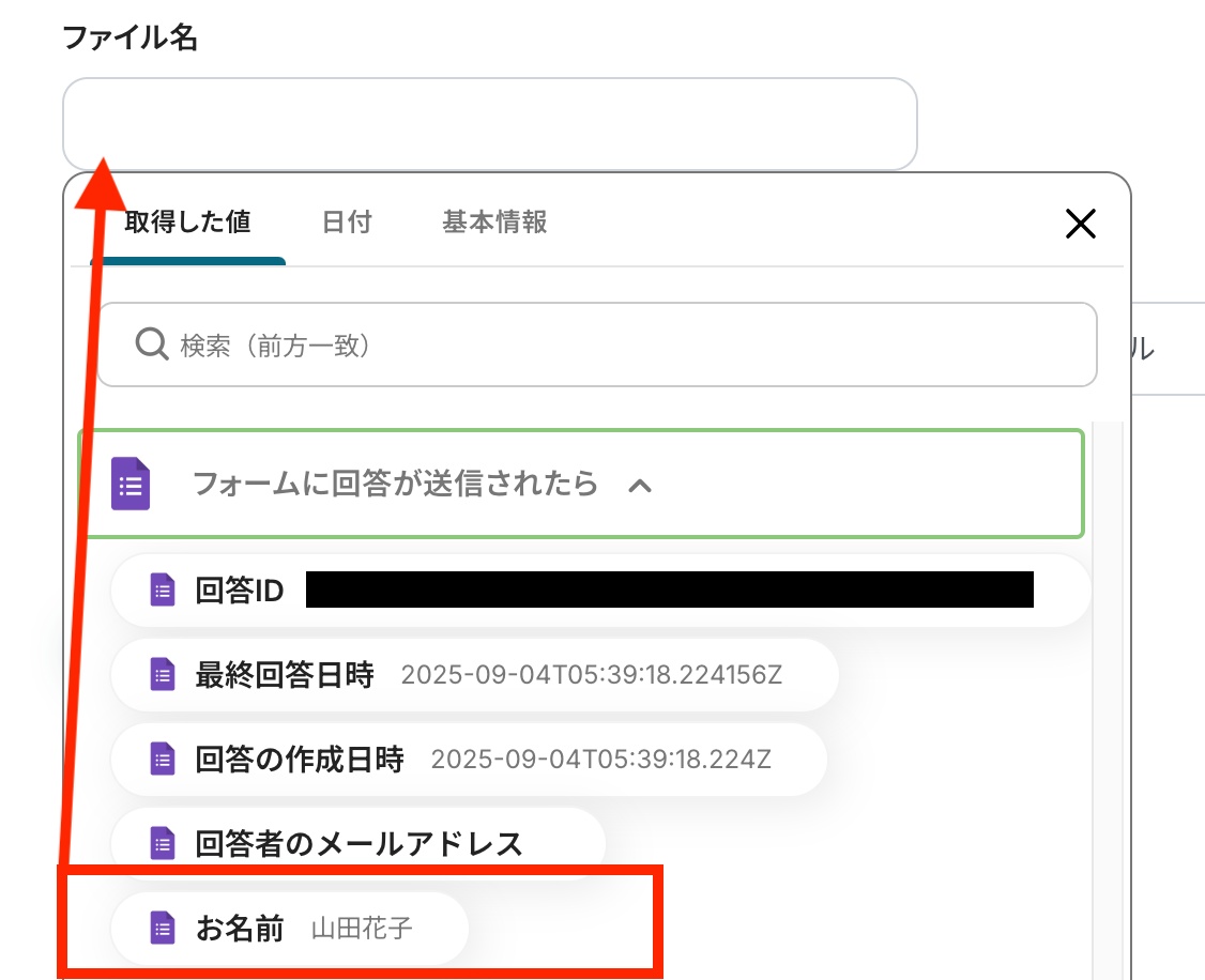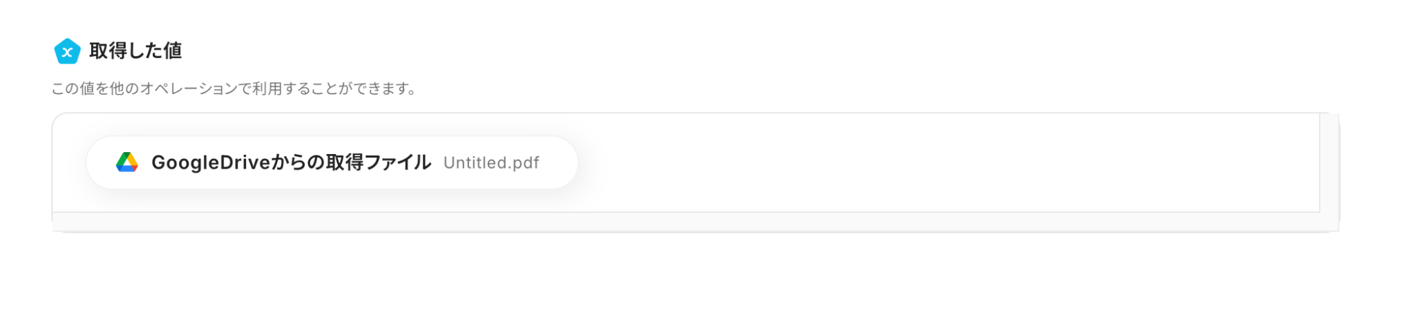 下図のようにアウトプットを活用することで、受け取ったデータファイルに設定されている名前で格納できるようになりますよ!また、取得した値を活用することで、固定値ではなく、トリガーが実行されるたびに最新の情報が反映できます。
