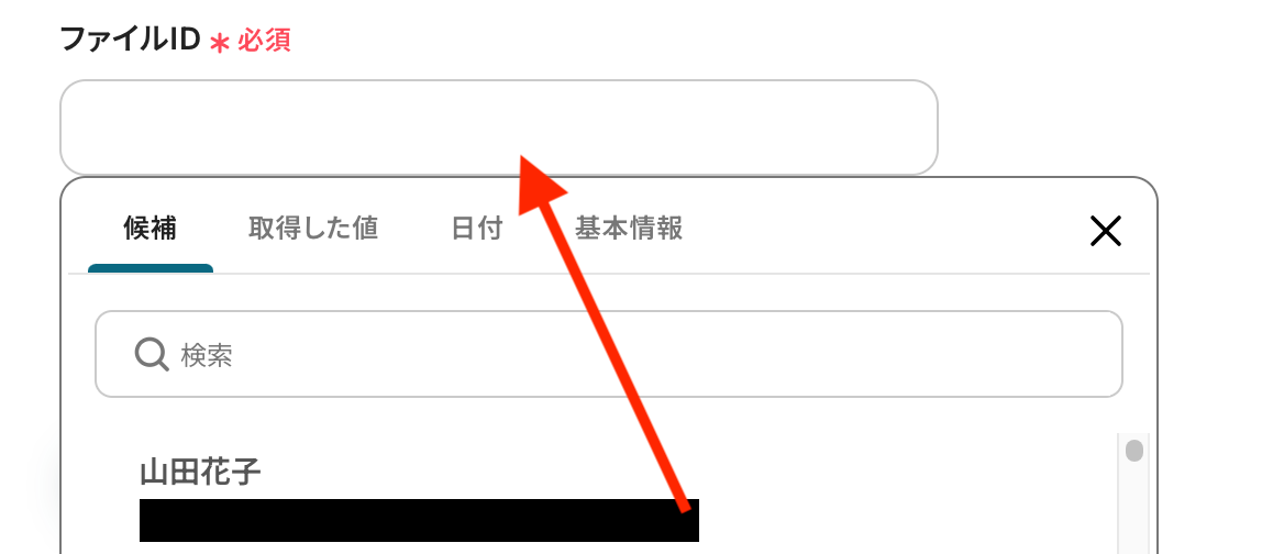格納先のフォルダID:入力欄をクリックすると、連携しているアカウントに紐づいた候補が表示されます。