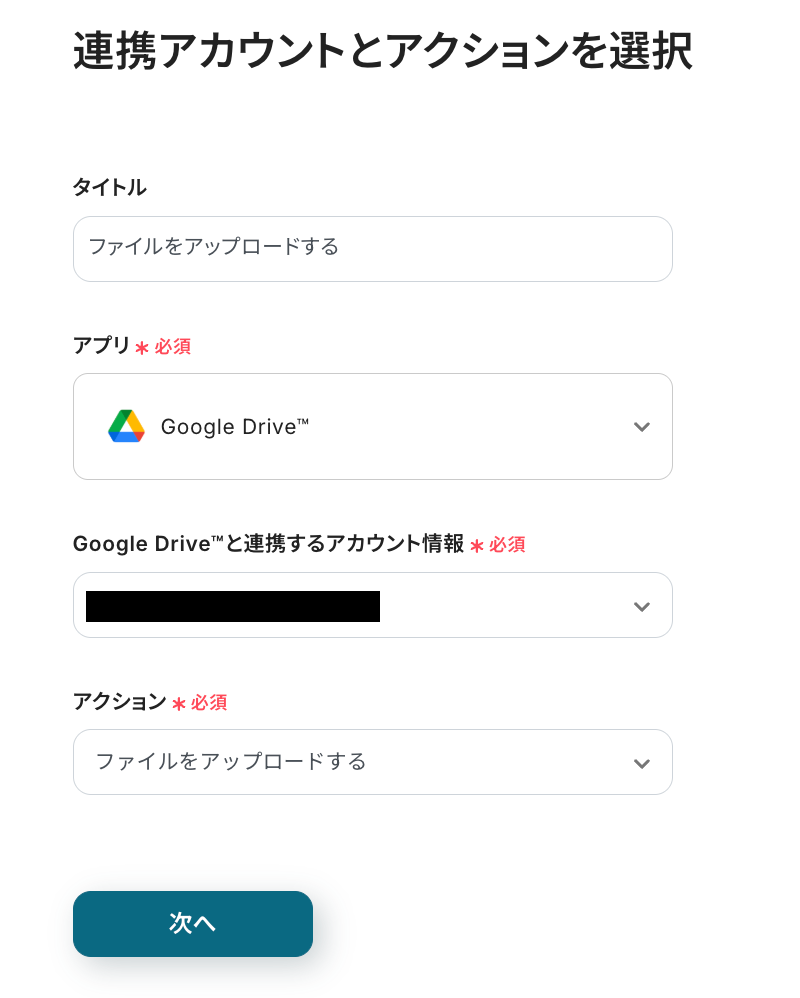 アクションは「ファイルをアップロードする」のままにして、「次へ」を押してください。