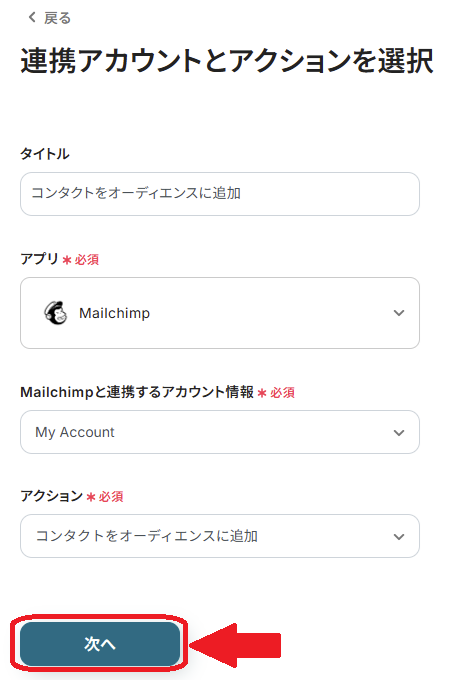 アクションが「コンタクトをオーディエンスに追加」になっているか、確認して「次へ」をクリックします。
