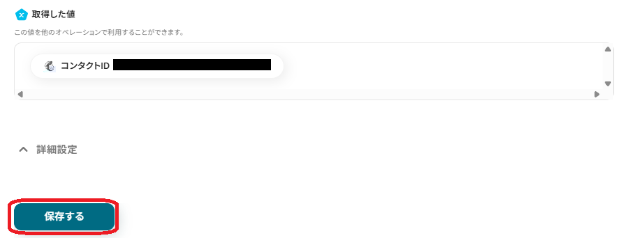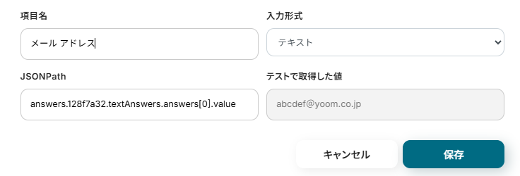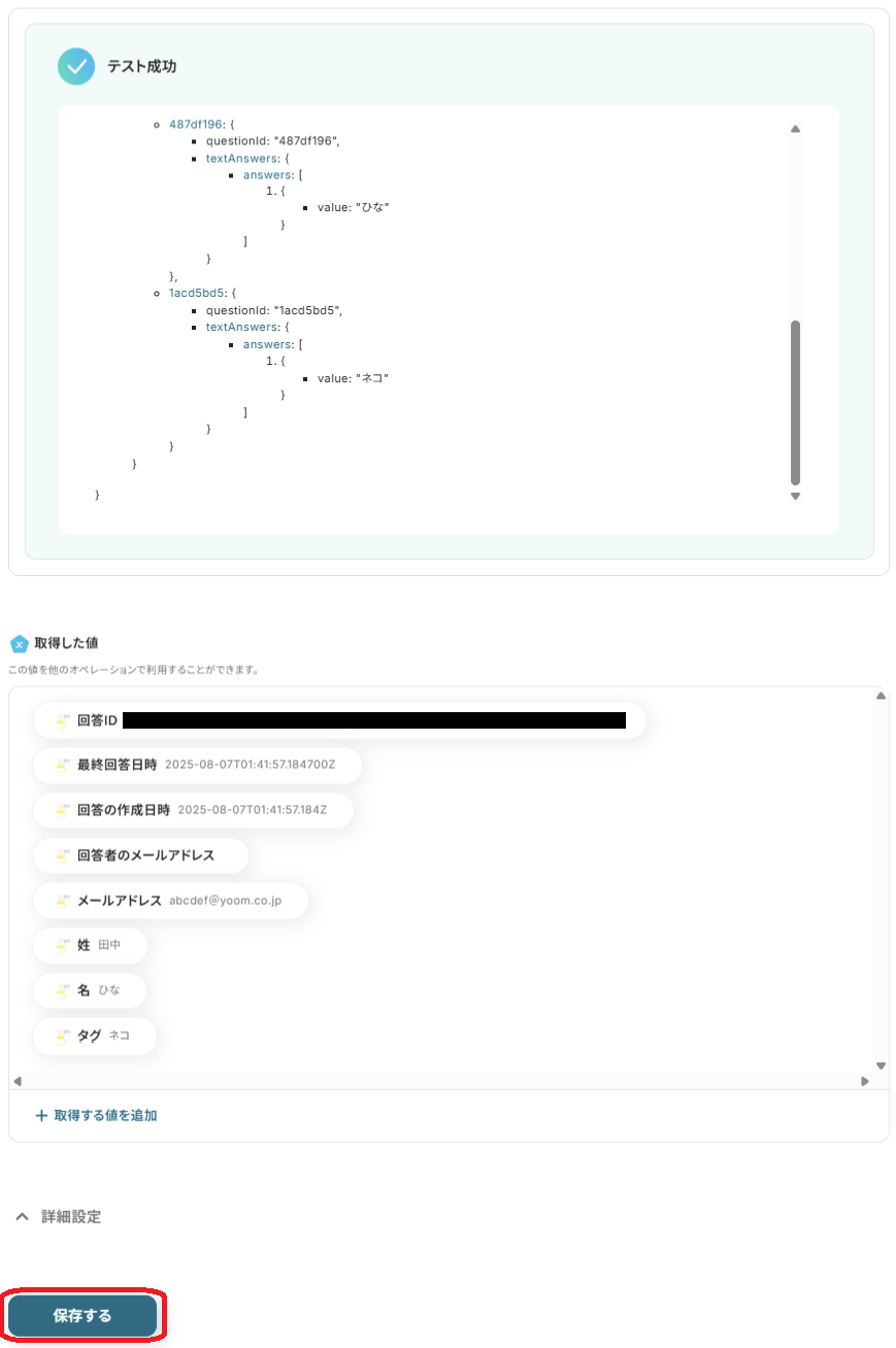 テストが成功したら、取得した値にGoogleフォームの項目を追加して「保存する」をクリックします。