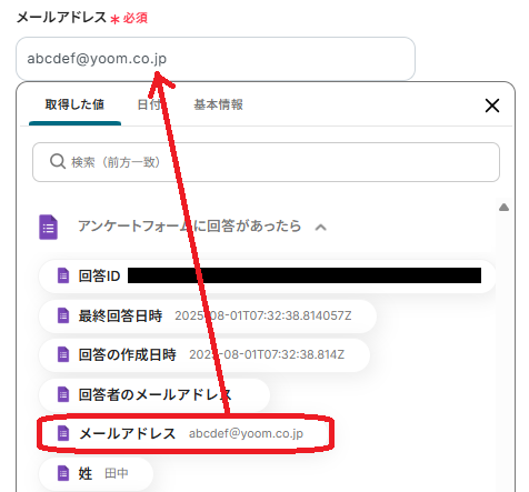 メールアドレス:「アンケートフォームに回答があったら」のプルダウンを開いて、選択