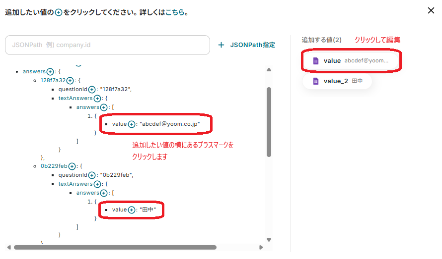 プラスマークをクリックすると、右側に表示されるのでそれぞれクリックして編集していきます。