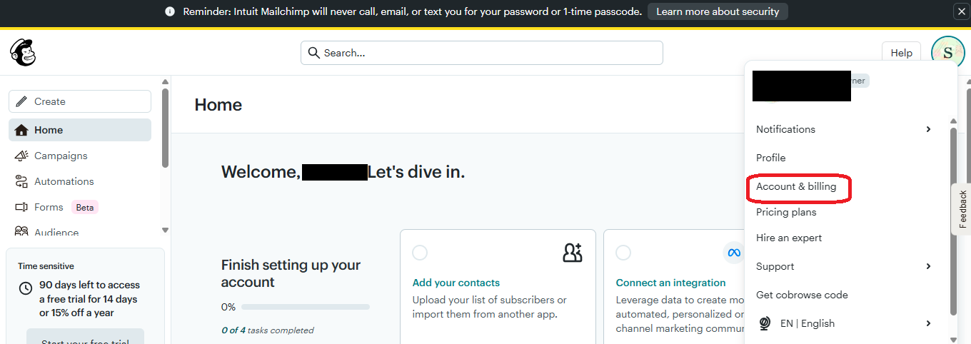 以下の画像のように、Mailchimp公式サイトにログインして、アイコンのAccount & billingより表示することができます。