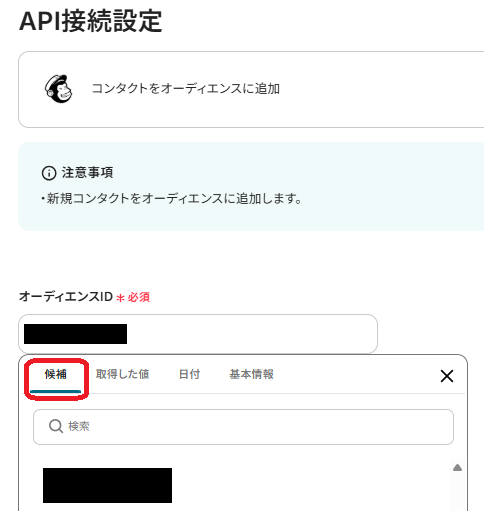 オーディエンスID:フレーム内をクリックし、「候補」から使用するオーディエンスを選択