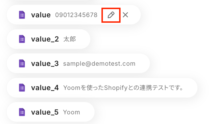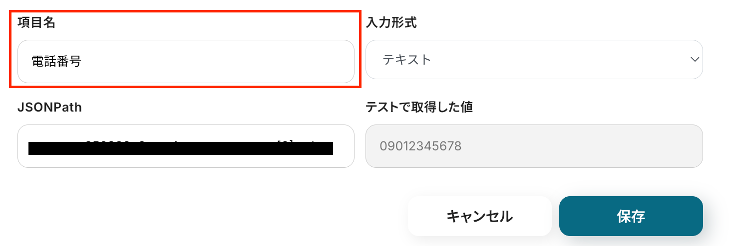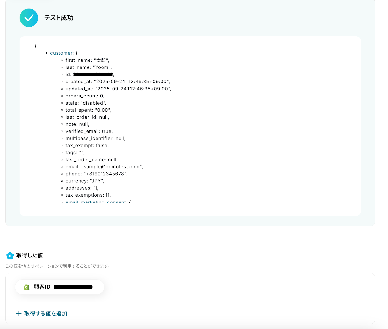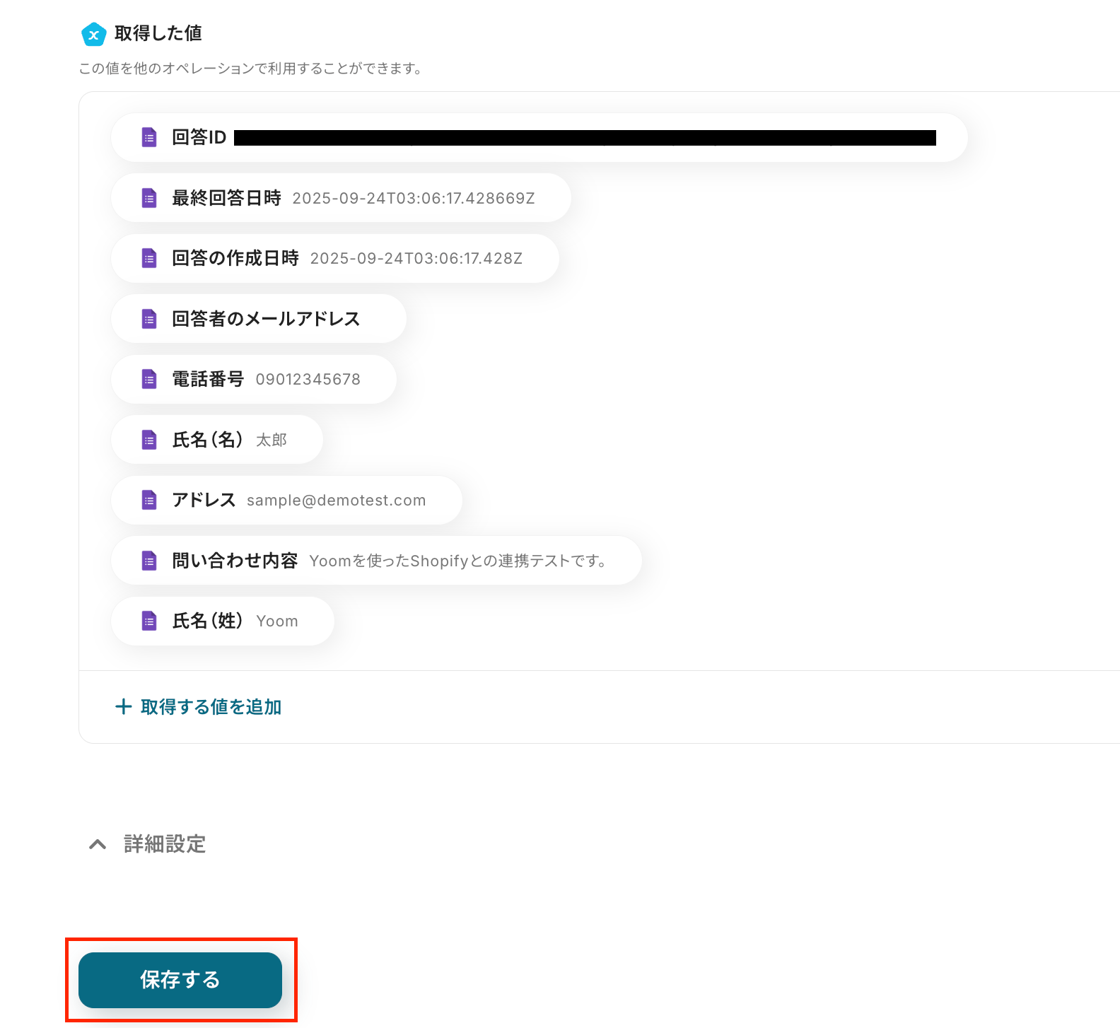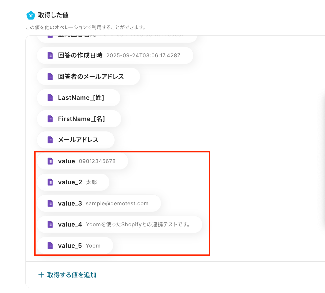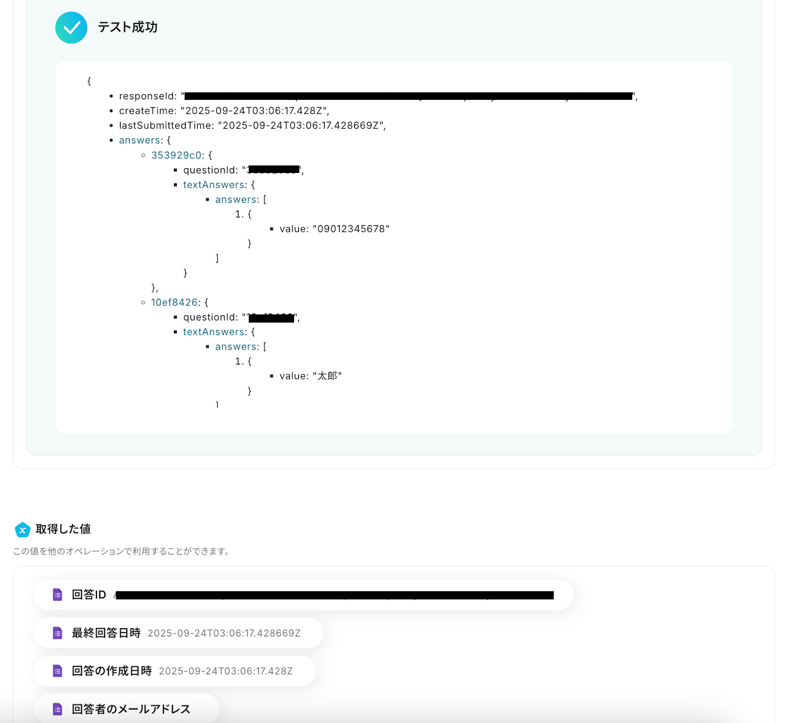 テストが成功すると、先ほど送信した回答データが「取得した値」として抽出されるので、内容を確認しましょう。