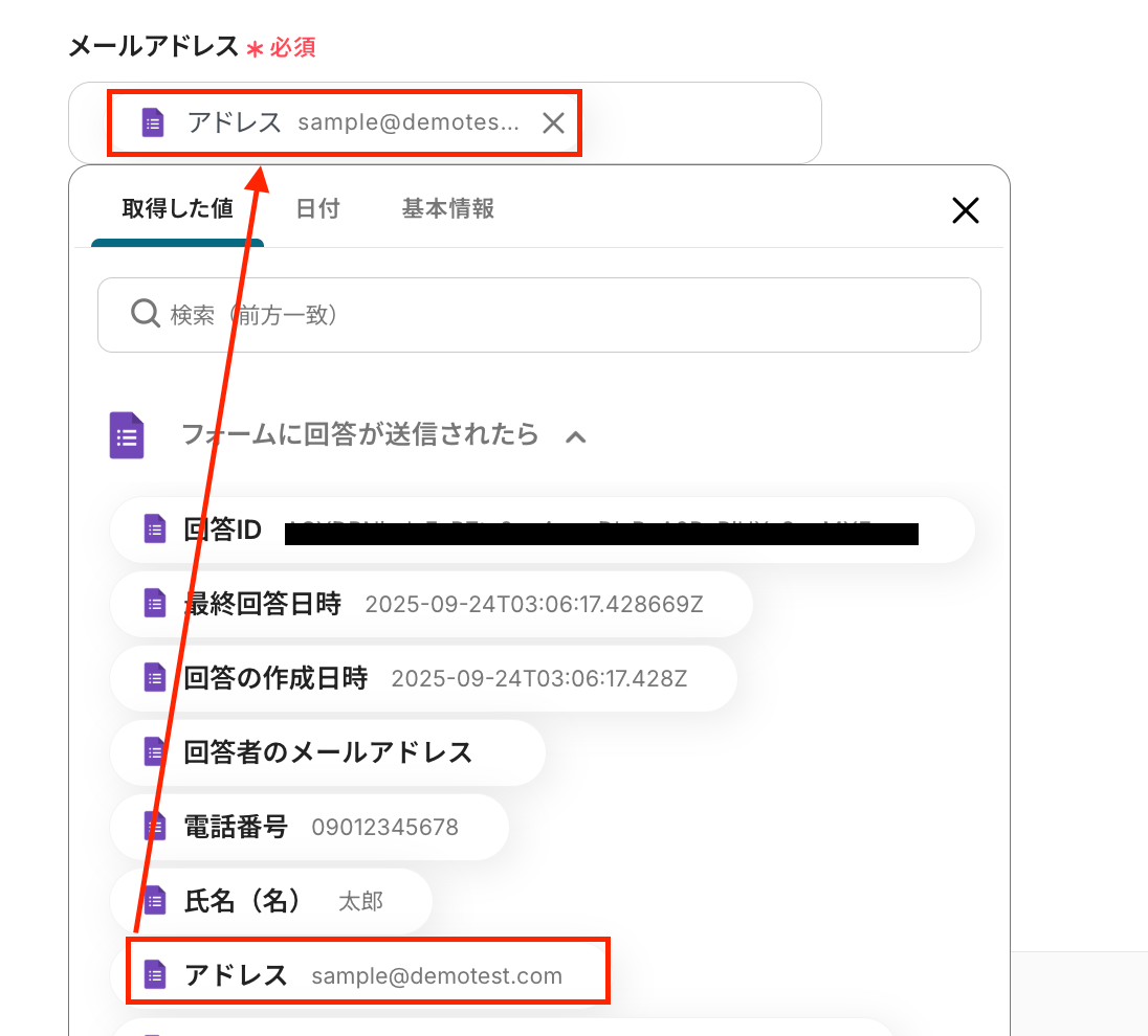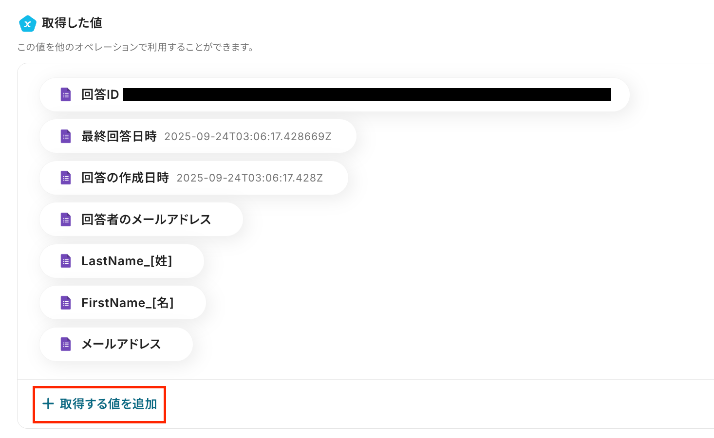 取得した値:データを連携させる条件として指定する、Googleフォームの回答データを設定します。