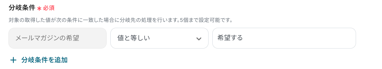 例えば、「メールマガジンの希望有無」を分岐条件としたい場合は下図のような設定になります。