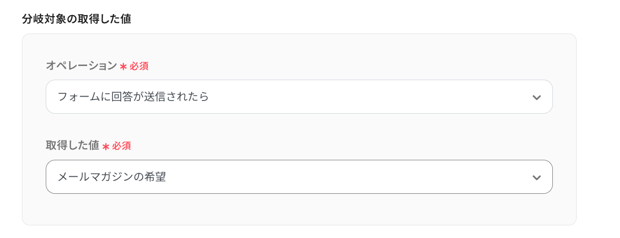「分岐条件」では、先ほど指定した「取得した値」がどのような条件を満たす場合に、後続のオペレーションへデータを連携するかを指定します。