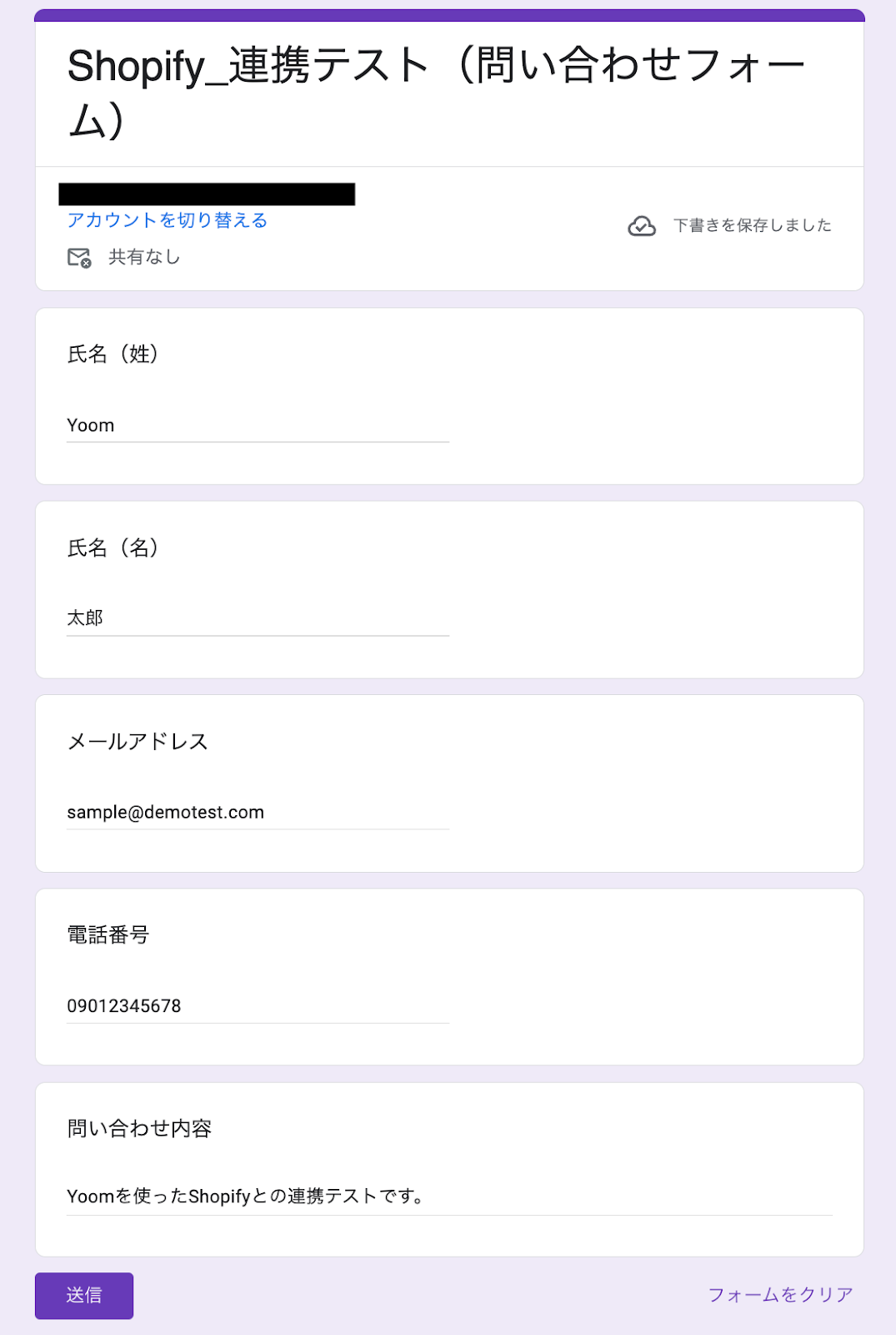 今回は下図のようなフォームを用意し、テスト用の回答を送信しました。