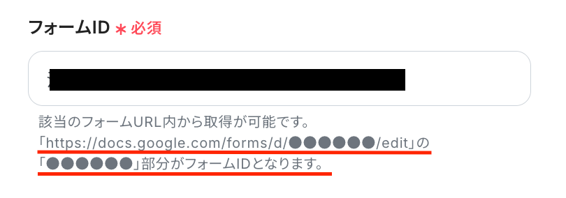 「フォームID」は、入力欄下に記載されている注釈を参考に、フローで使用するフォームのURLから値を確認して入力しましょう。