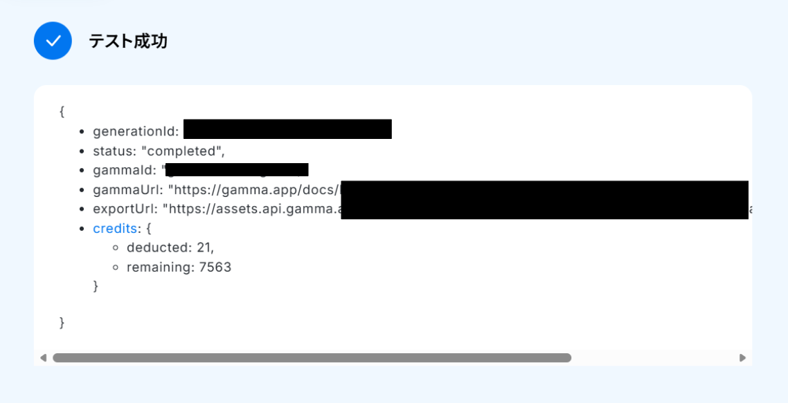 「生成ID」に「Gammaを生成」で取得した「生成ID」を使用します。 入力が終わったら「テスト」をクリックしましょう!