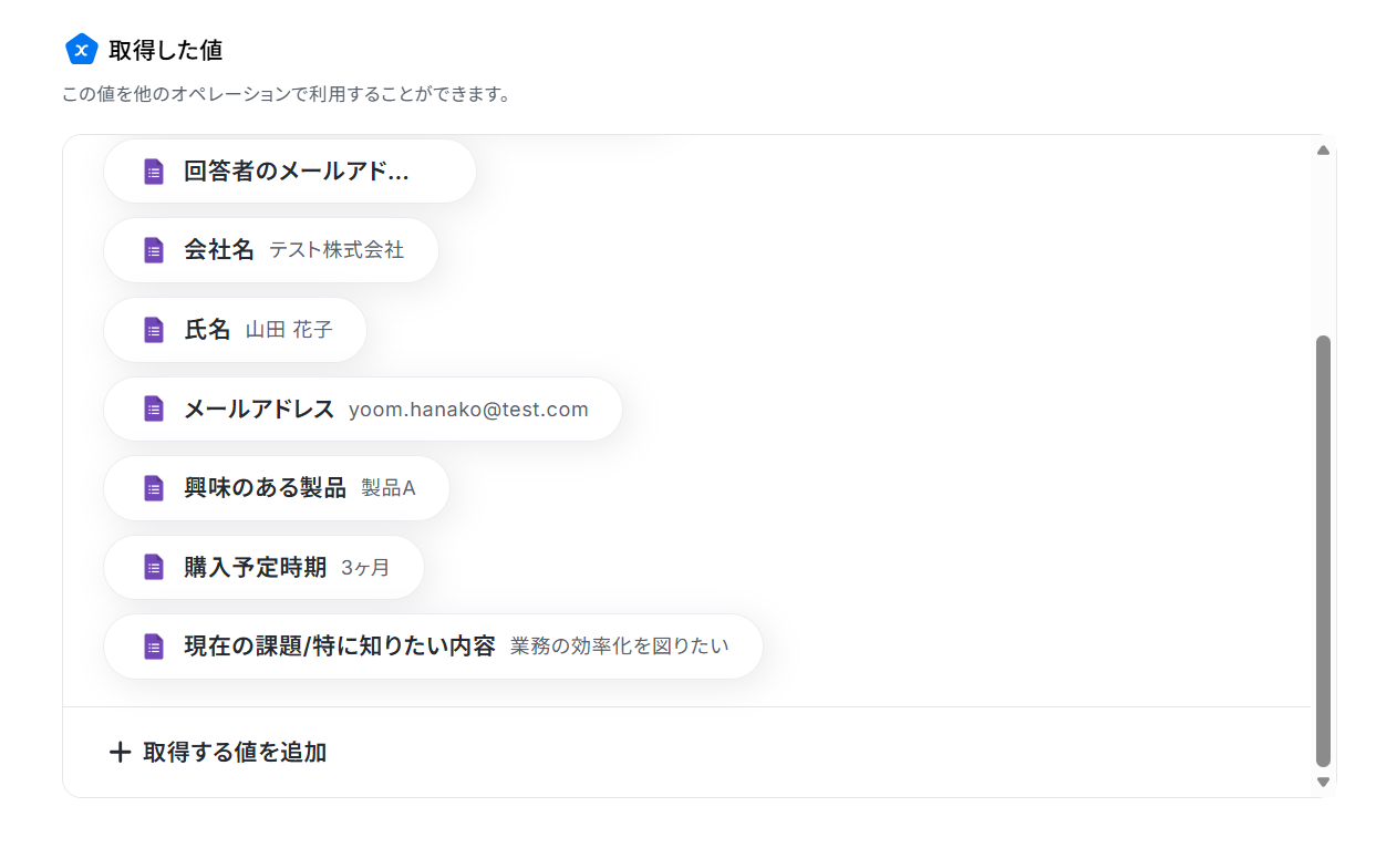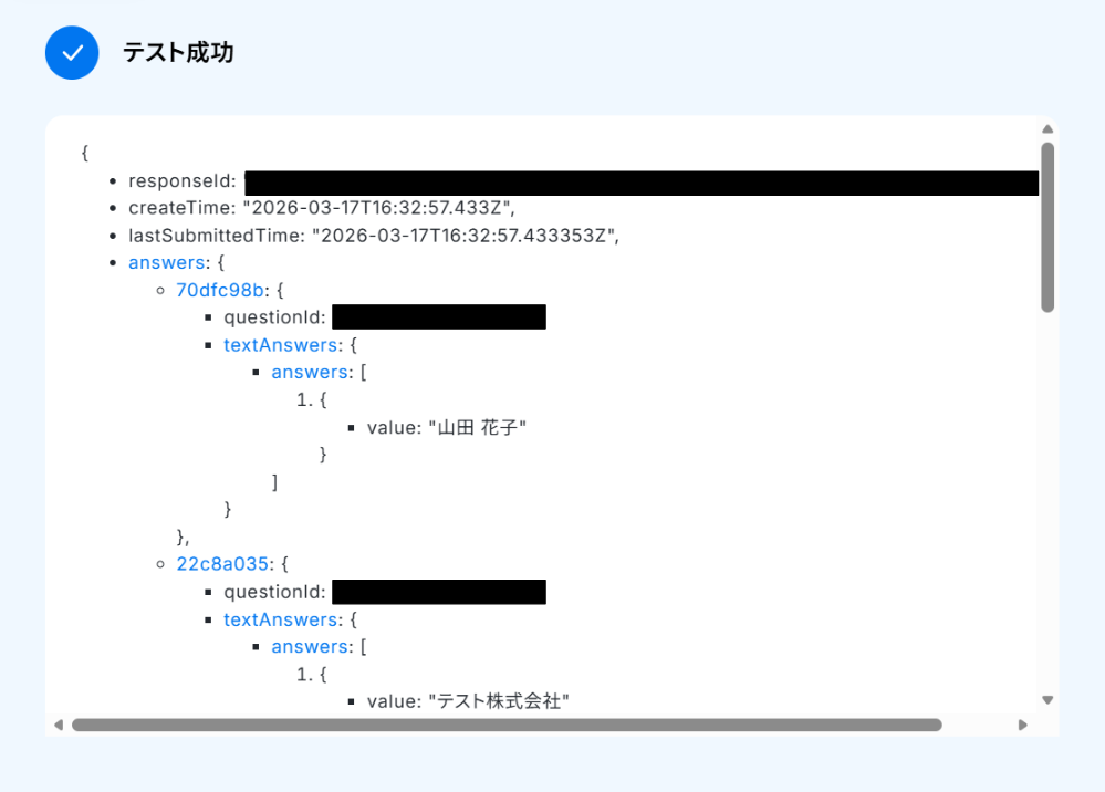 テストに成功すると「取得した値」にGoogleフォームの情報が反映されます。