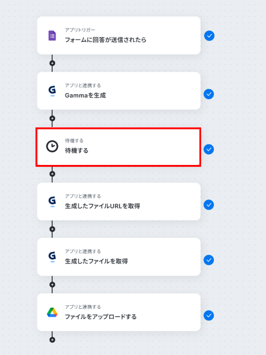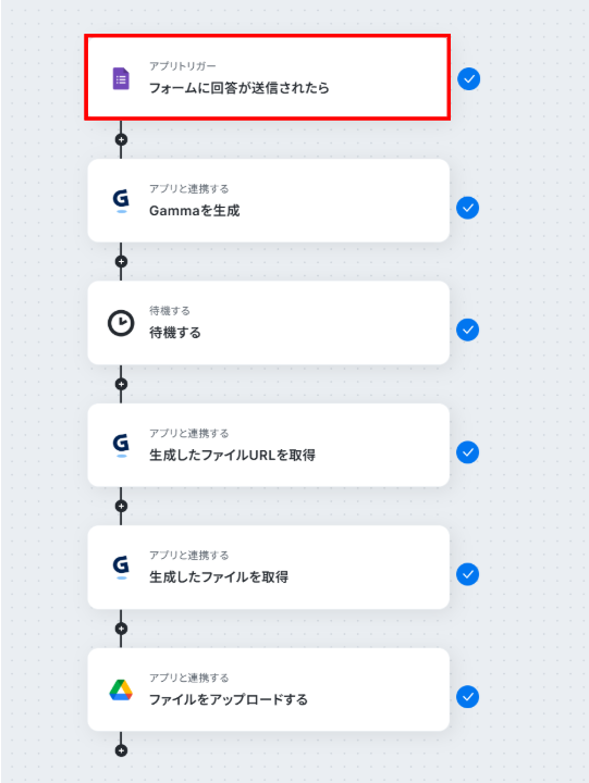 はじめに、Gamma、Googleフォーム、Google DriveをYoomと連携します 次に、トリガーでGoogleフォームを選択し、「フォームに回答が送信されたら」というアクションを設定します 次に、オペレーションでGammaの「Gammaを生成」アクションを設定し、フォームの回答内容をもとに資料を生成します その後、オペレーションで「待機する」アクションを設定し、Gammaのファイル生成が完了するまで待機します 次に、オペレーションでGammaの「生成したファイルURLを取得」「生成したファイルを取得」アクションを設定します 最後に、オペレーションでGoogle Driveの「ファイルをアップロードする」アクションを設定し、生成されたファイルを指定のフォルダに保存します ※「トリガー」:フロー起動のきっかけとなるアクション、「オペレーション」:トリガー起動後、フロー内で処理を行うアクション■このワークフローのカスタムポイント