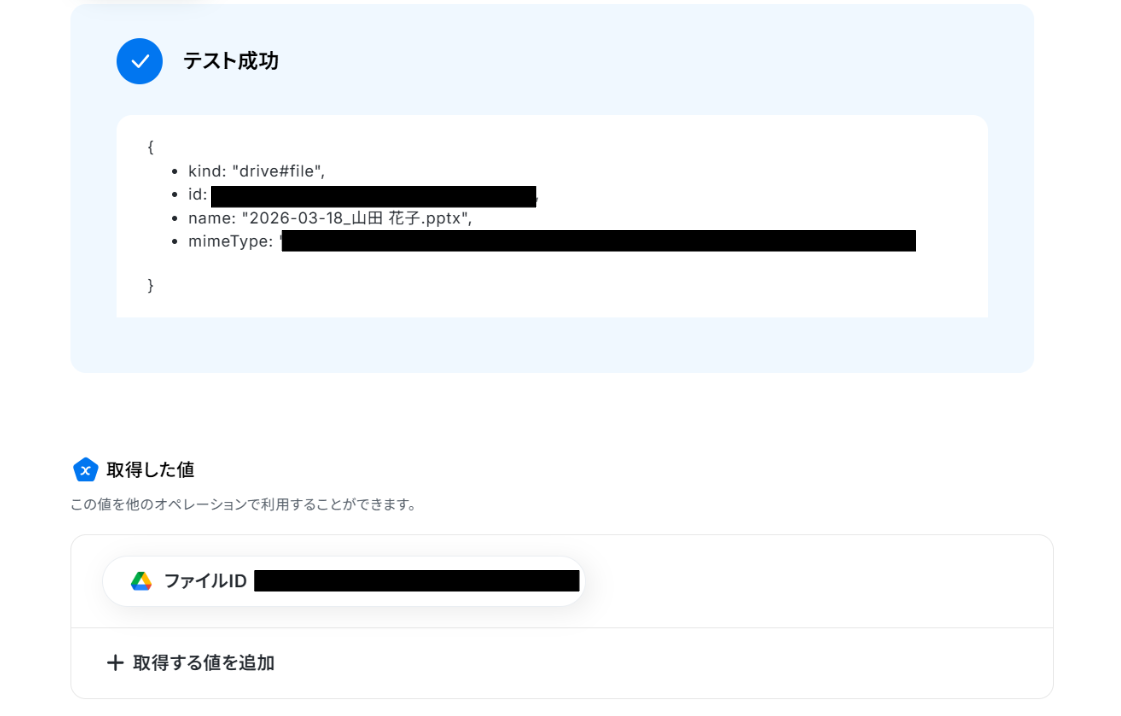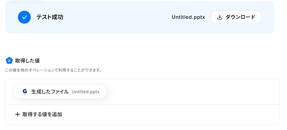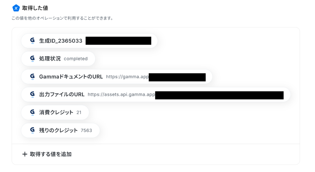 テストに成功すると、「取得した値」にGammaで生成されたファイルの情報が追加されました! 「完了」をクリックして次の工程に進みましょう。