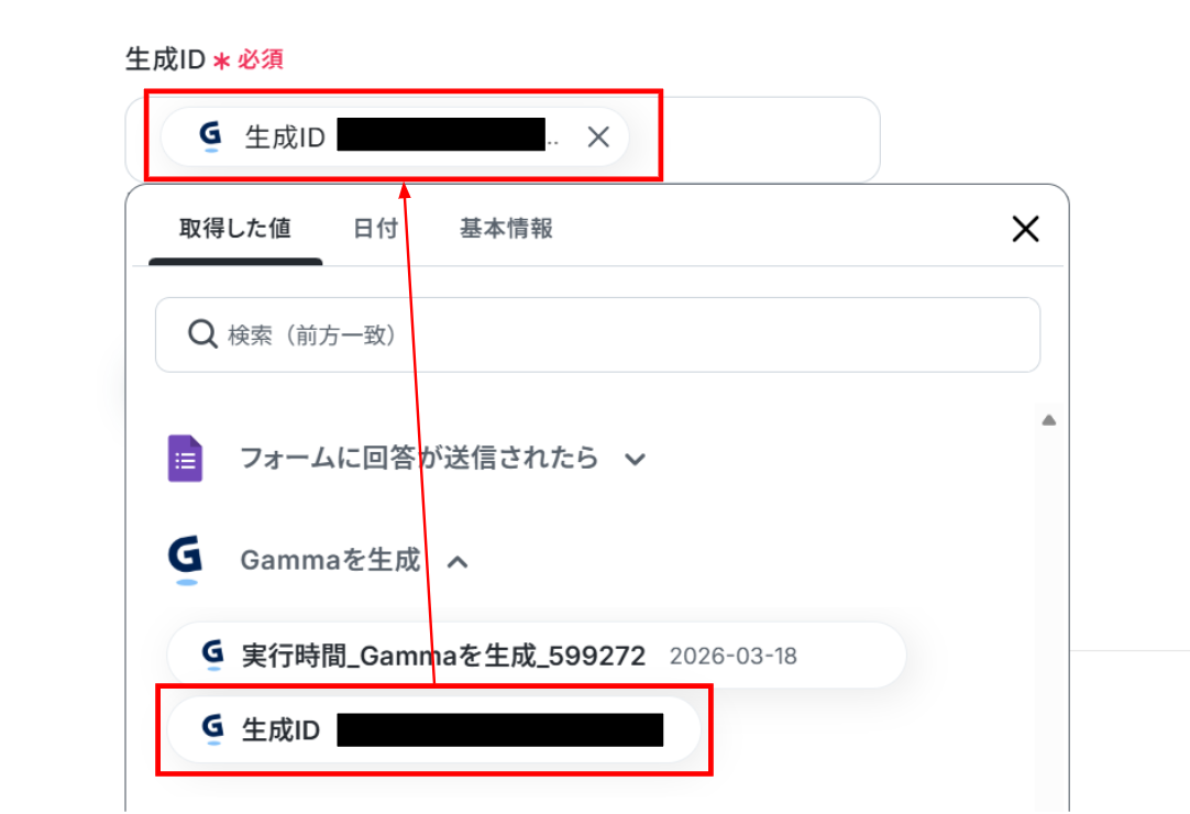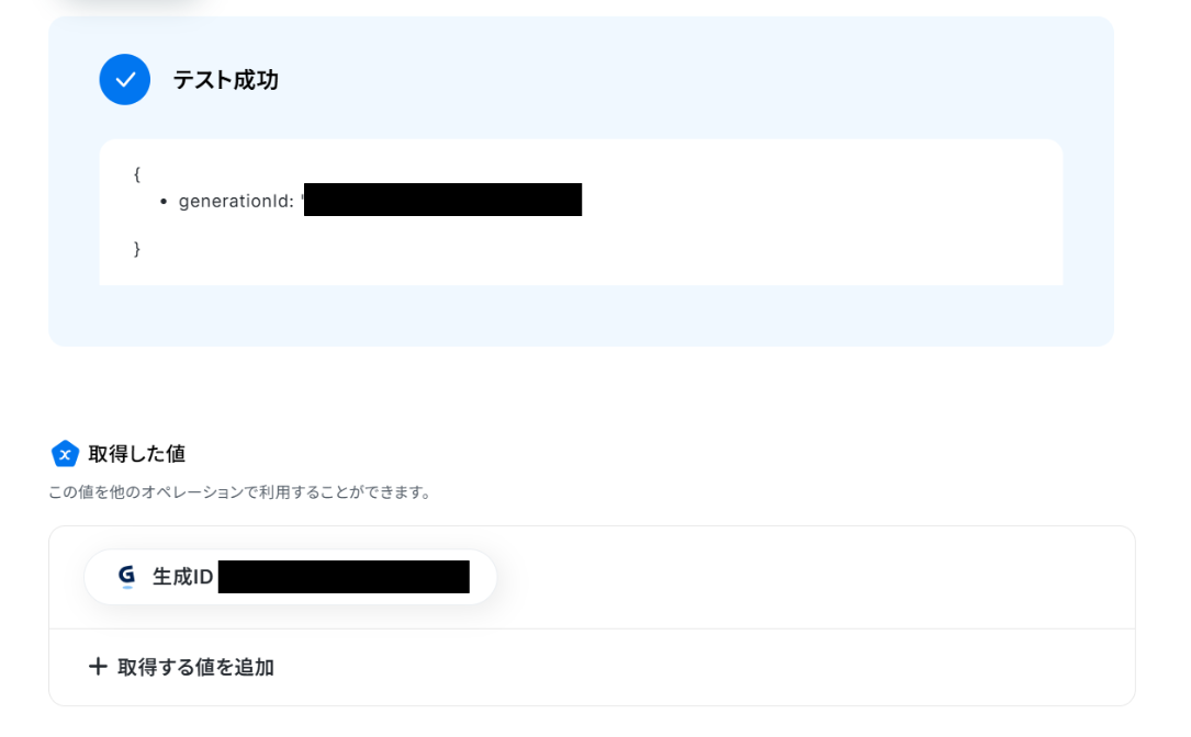 テストに成功しました! テストに成功すると、「取得した値」にGammaの「生成ID」が追加されました。 「完了」をクリックして次の工程に進みましょう。