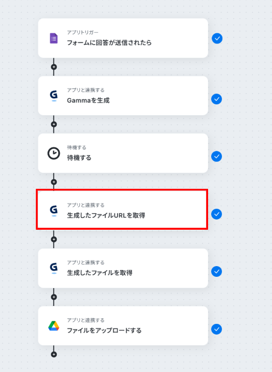 ステップ6:生成したファイルURLを取得する 次は、Gammaで生成したファイルURLの情報を取得します! 「生成したファイルURLを取得」をクリックします。