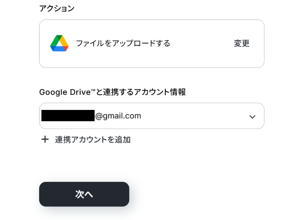 Google Driveと連携するアカウント情報に誤りがないかを確認し、アクションは「ファイルをアップロードする」のままで「次へ」をクリックします。