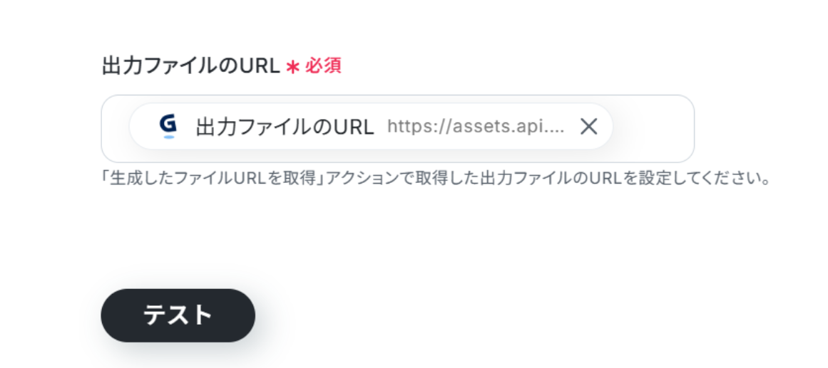 「出力ファイルのURL」に前工程で取得した値を入力します。 入力が終わったら「テスト」をクリックしましょう!