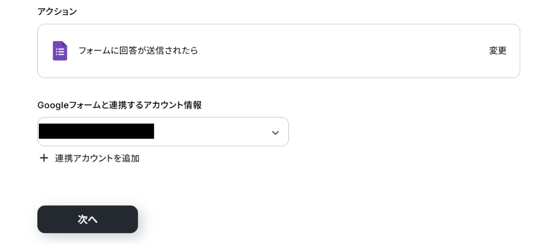 Googleフォームと連携するアカウント情報に誤りがないかを確認し、アクションは「フォームに回答が送信されたら」のままで「次へ」をクリックします。