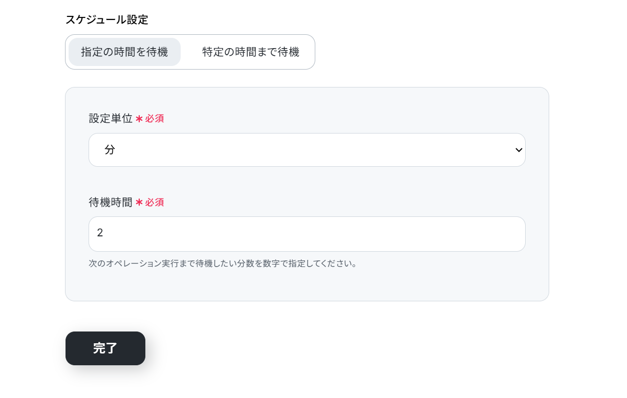 詳しい設定方法は「待機する」の設定方法 をご参照ください。 入力が終わったら「完了」をクリックしましょう。