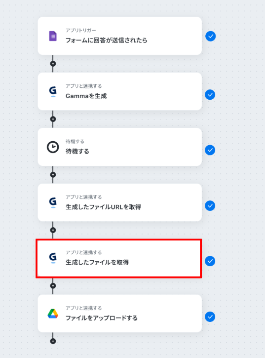 ステップ7:生成したファイルを取得する 次は、Gammaで生成したファイルを取得します! 「生成したファイルを取得」をクリックします。 ※トリガー、各オペレーションでの取り扱い可能なファイル容量の詳細は「ファイルの容量制限について 」をご参照ください。