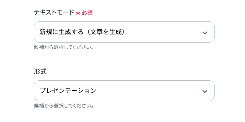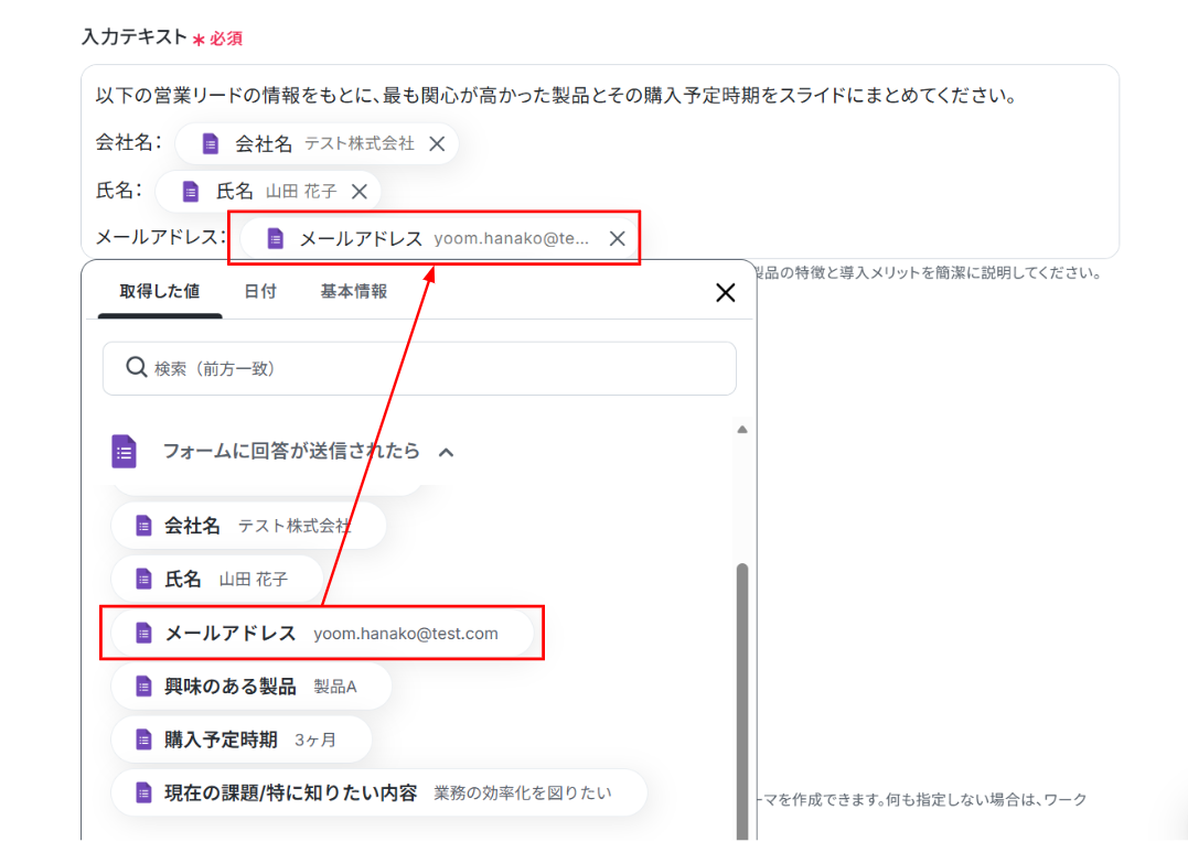「入力テキスト」に生成するための指示内容を入力します。 画像のように「取得した値」を使うことで、都度変更することなくGoogleフォームの最新の情報を反映することができます。