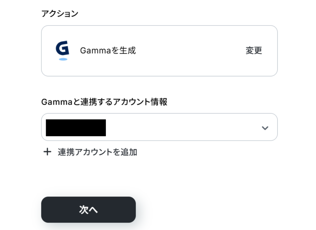 Gammaと連携するアカウント情報に誤りがないかを確認し、アクションは「Gammaを生成」のままで「次へ」をクリックします。