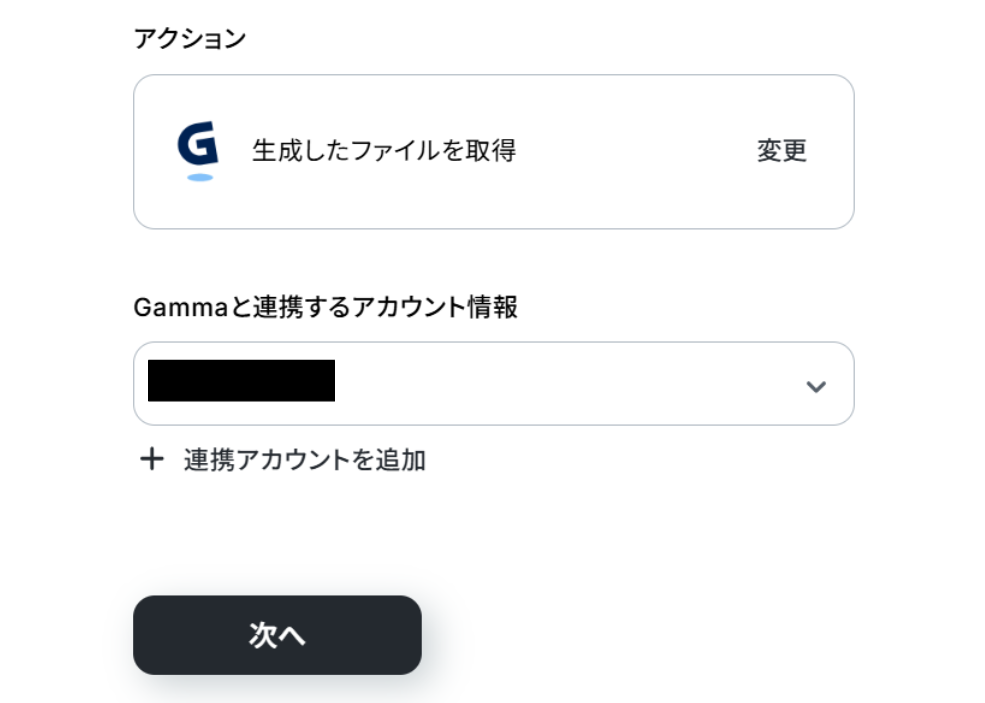 Gammaと連携するアカウント情報に誤りがないかを確認し、アクションは「生成したファイルを取得」のままで「次へ」をクリックします。