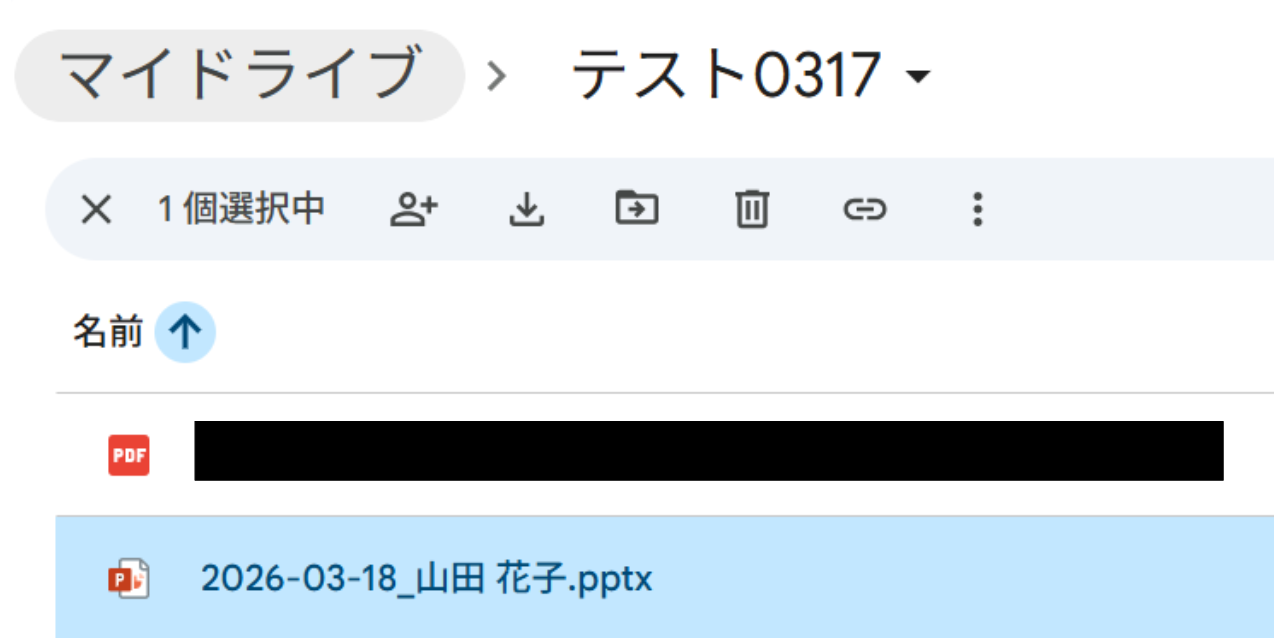 ファイル名:取得した値や日付を使って自由に入力可能(画像では、日付-氏名.pptx)
